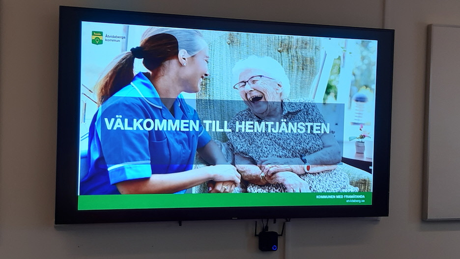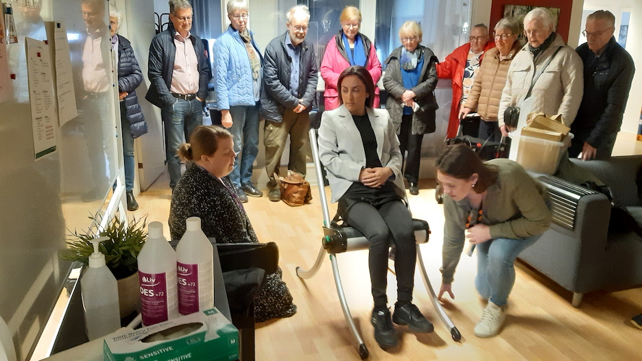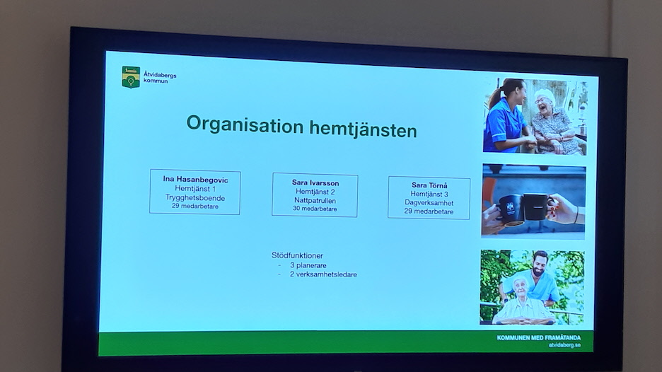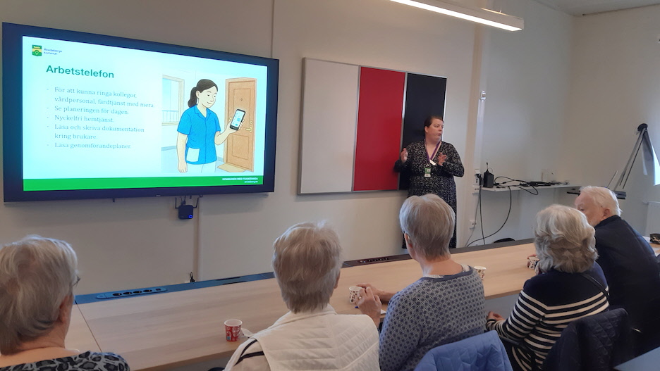 Clara Säberg som utöver att vara en av två Aktivitetssamordnare visade och redogjorde för de tekniska och digitala hjälpmedel som erbjudes som stöd i verksamheten. Som exempel visades den medicinrobot som kan tillhandahållas till den enskilde för att säkerställa delningen av mediciner. Arbetstelefonen som är ett viktigt verktyg för personalen där alltifrån dagens arbetsschema finns och där journalanteckningar efter utfört arbete göres användes också till att öppna och låsa i hemmen hos den som har hemtjänst.
