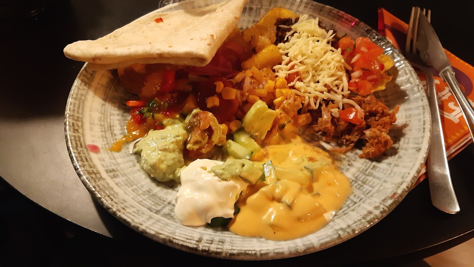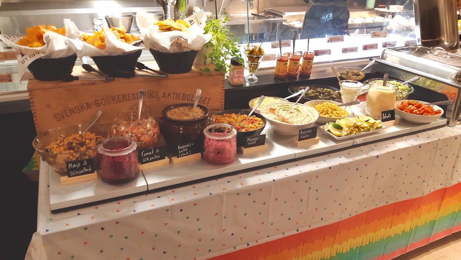 Cafét erbjöd vin, öl med olika smaker och vatten till maten för de som önskade. Buffén var smakfullt uppdukad med många olika sorters grönsaker, frukter och såser. Köttfärs, salsa, majs, ost och annat gott fanns också.