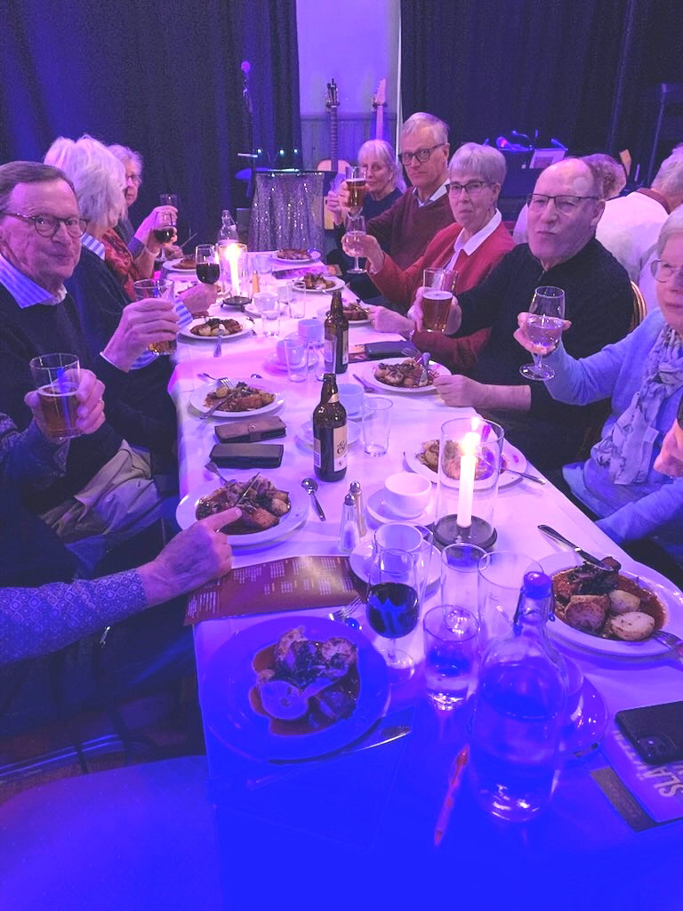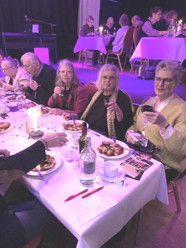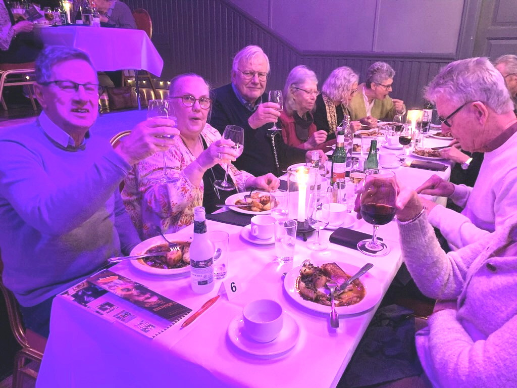 Väl inne i lokalen blev vi välkomnade av ensemblen fint uppklädda och visade till våra sittplatser. En god förrätt serverades och showen kunde börja. Mellan de olika akterna serverades varmrätt och efterrätt. Släkten är värst hette själva föreställningen med många dråpliga akter och bra musik därtill.