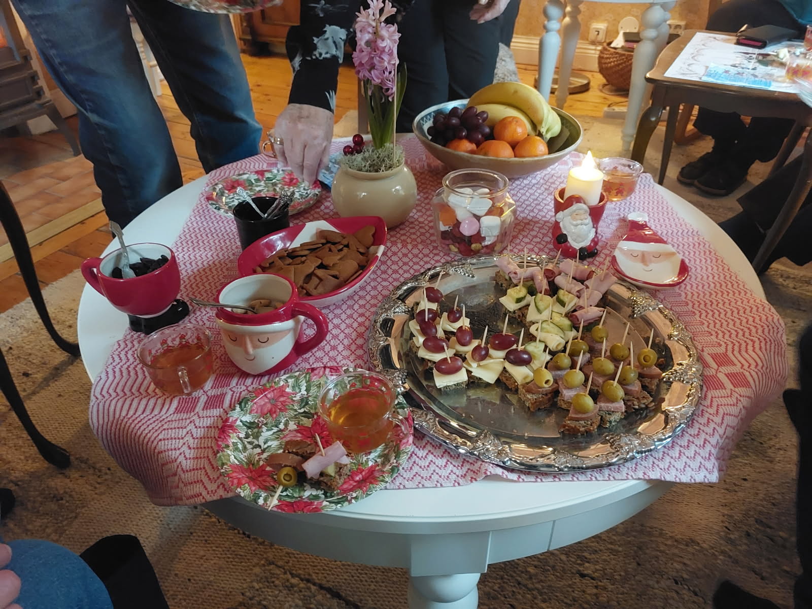 En fin dag lite kylig men en sol lyste på oss. Det blev en kortare promenad vid Narr konfektyr och Skattegården. Några passade på att besöka Narr konfektyr. På Skattegården intog vi fika och passade på att besöka jul rummet som öppnats för säsongen.