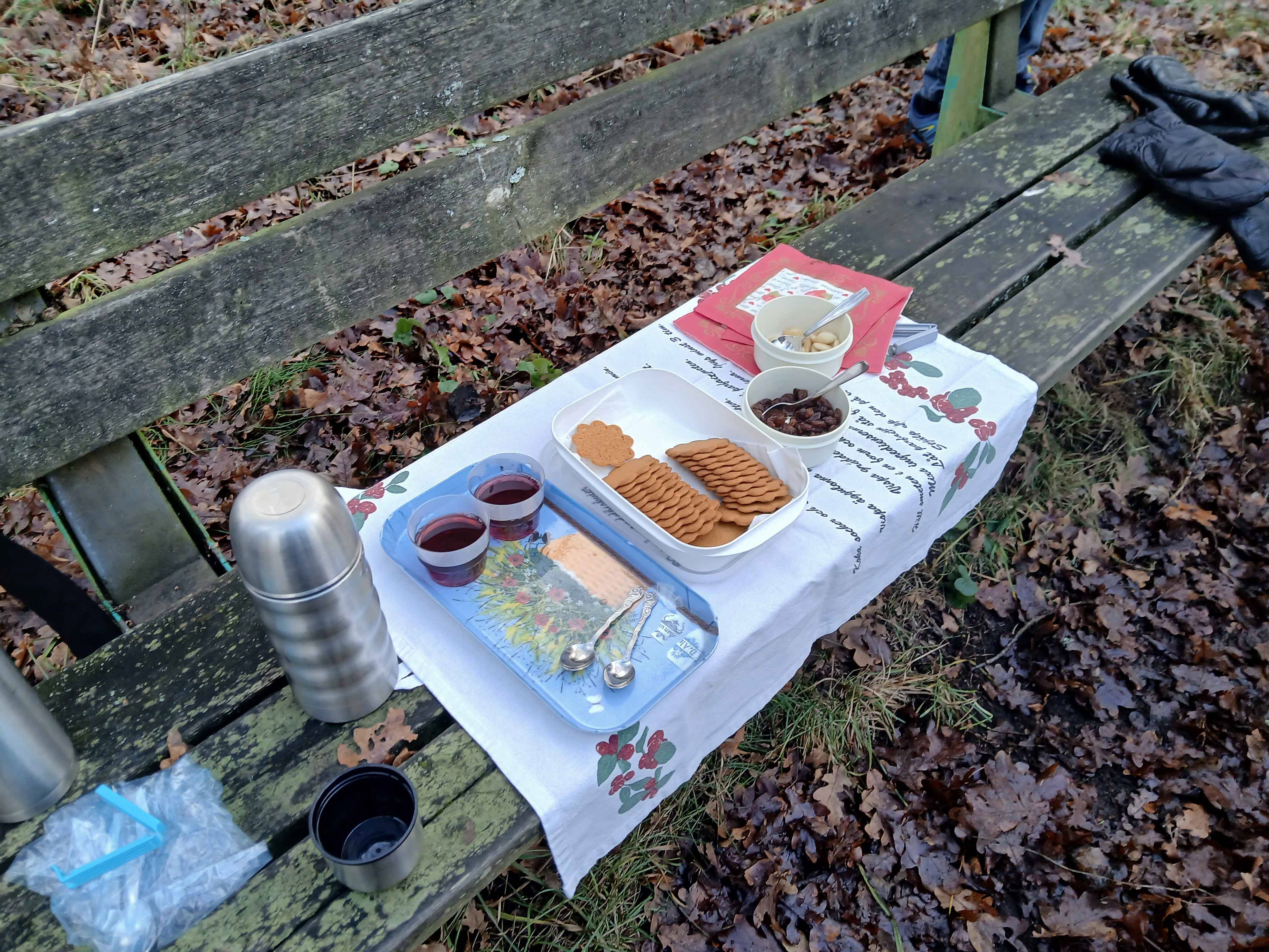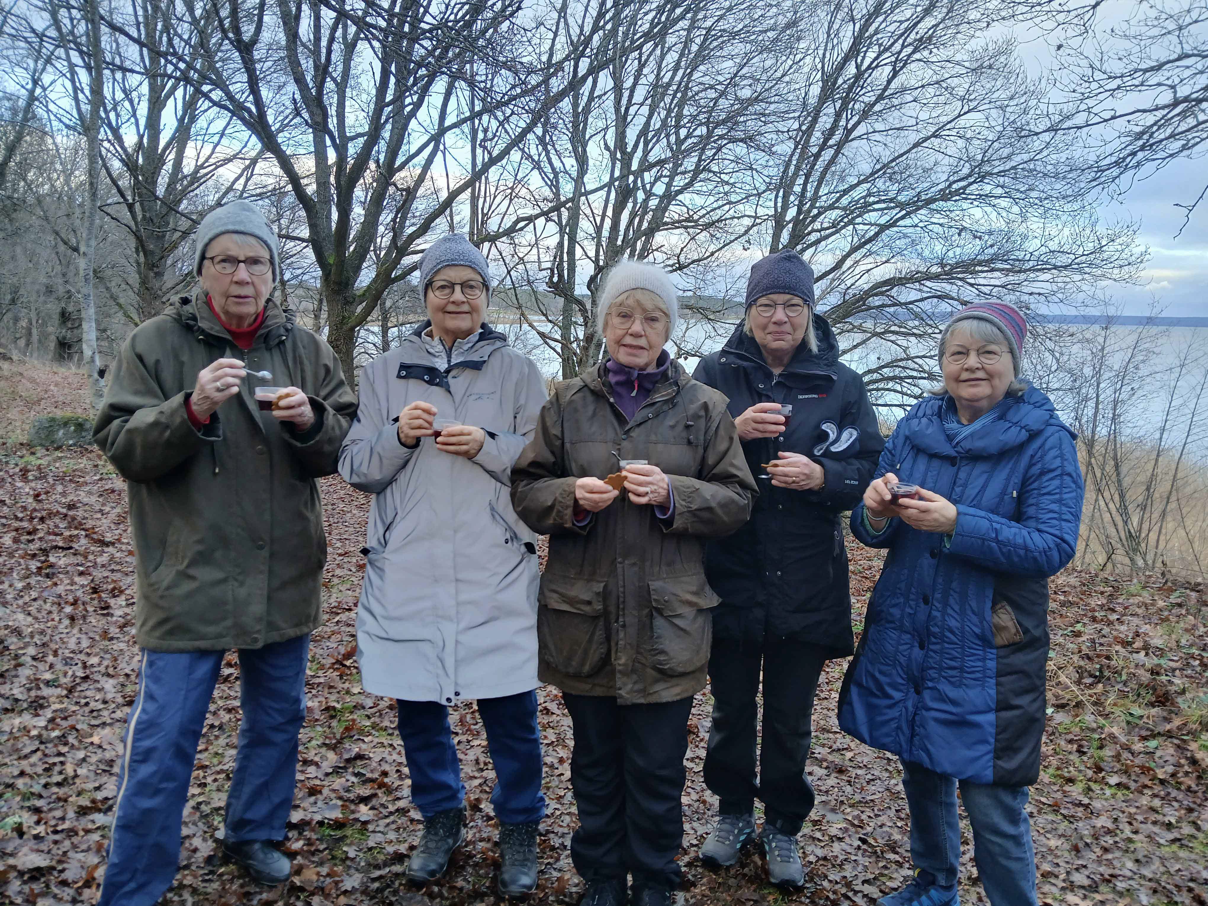 1 december bjöd på plusgrader och gråväder. Promenadgruppen förhöjde trivseln men en glöggstund ute i naturen och önskade varandra "Glad Advent"