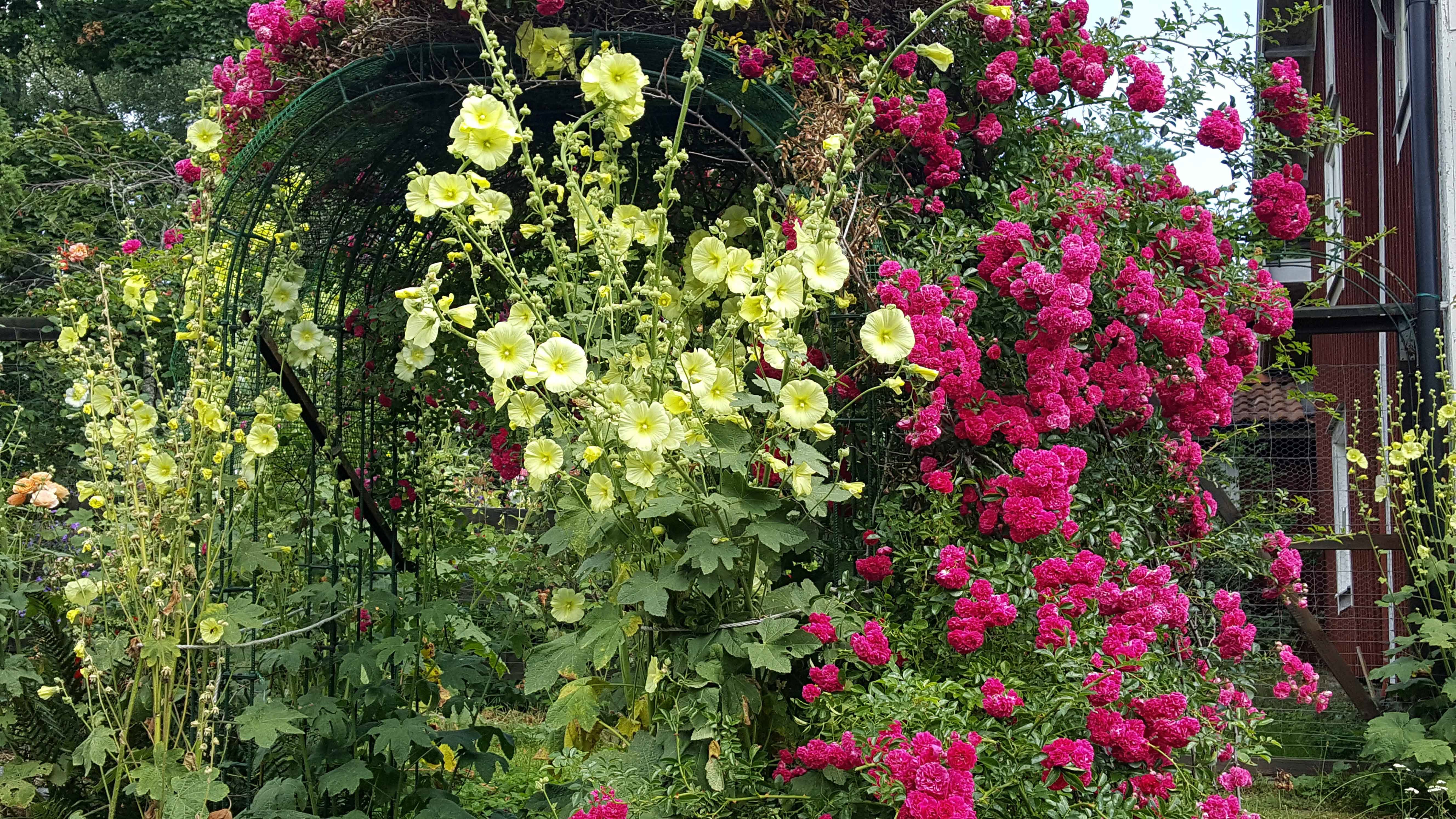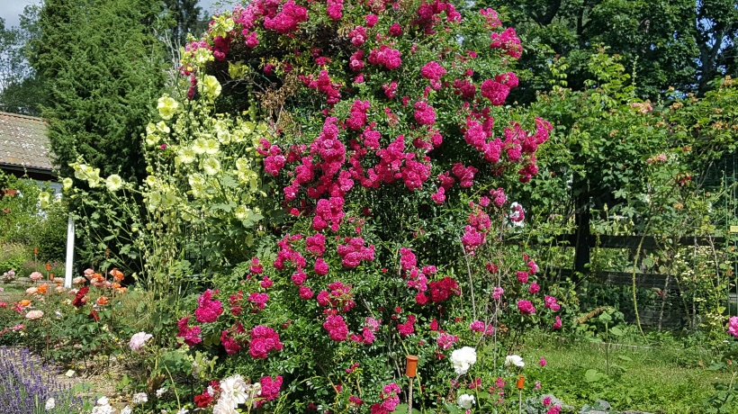 I trädgården finns 15 kärleksparskulpturer, 1 000 rosor, 700 rhododendron, många perenner, sällsynta träd, konsthall, anlagda dammar och stigar. Vi fick njuta av ett överdåd av blommande rosor under vår sommardag i trädgården.