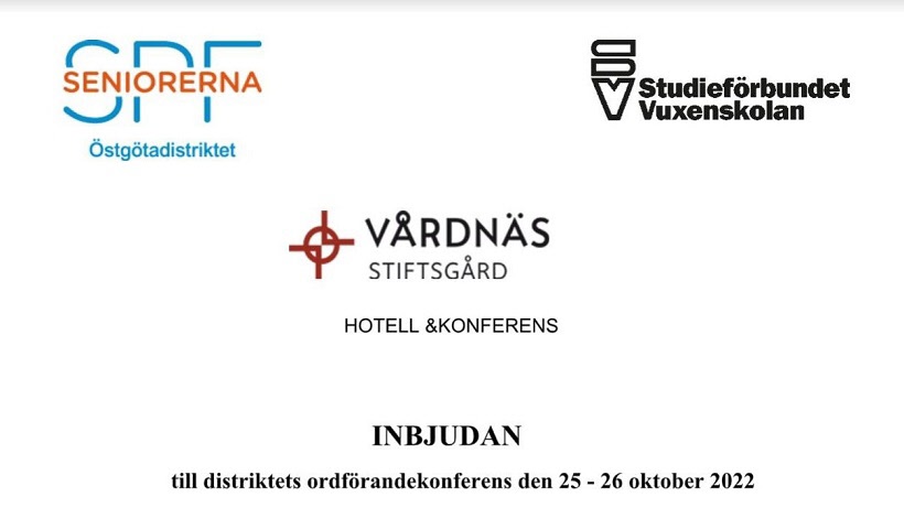Välkomna till Östgötadistriktets ordförandekonferens 2022. Konferensen kommer att genomföras på Vårdnäs Stiftsgård i Brokind.