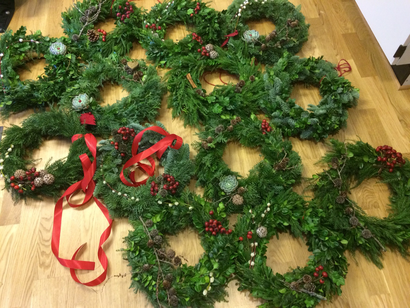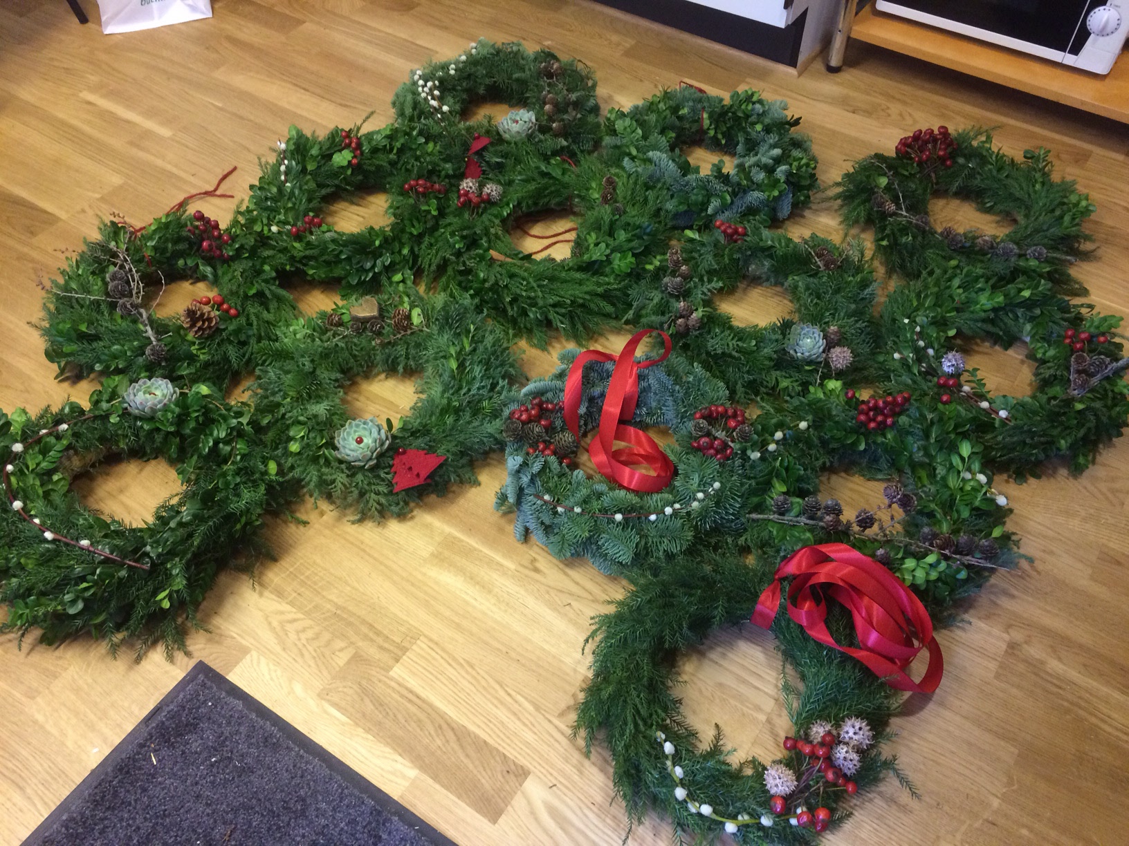 Dessa fina kransar tillverkades med stöd av medarbetare från Iris Blomsterhandel.