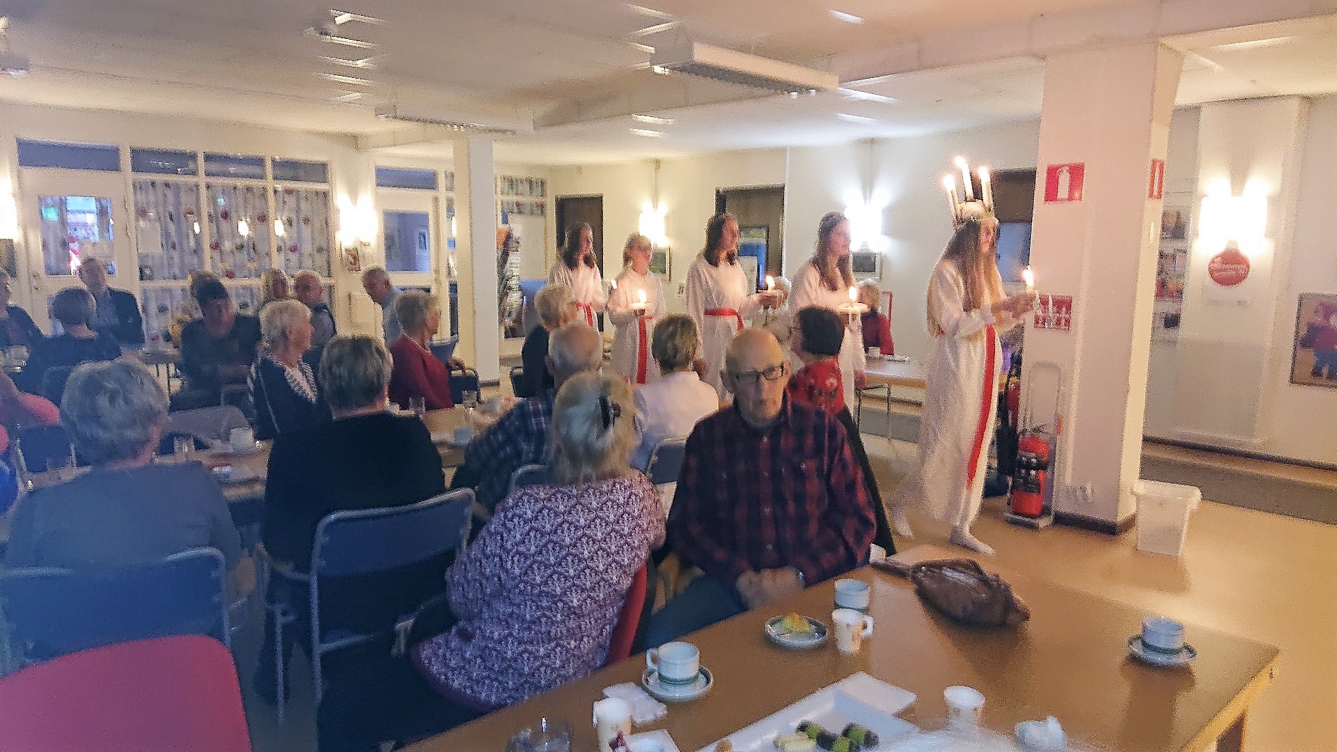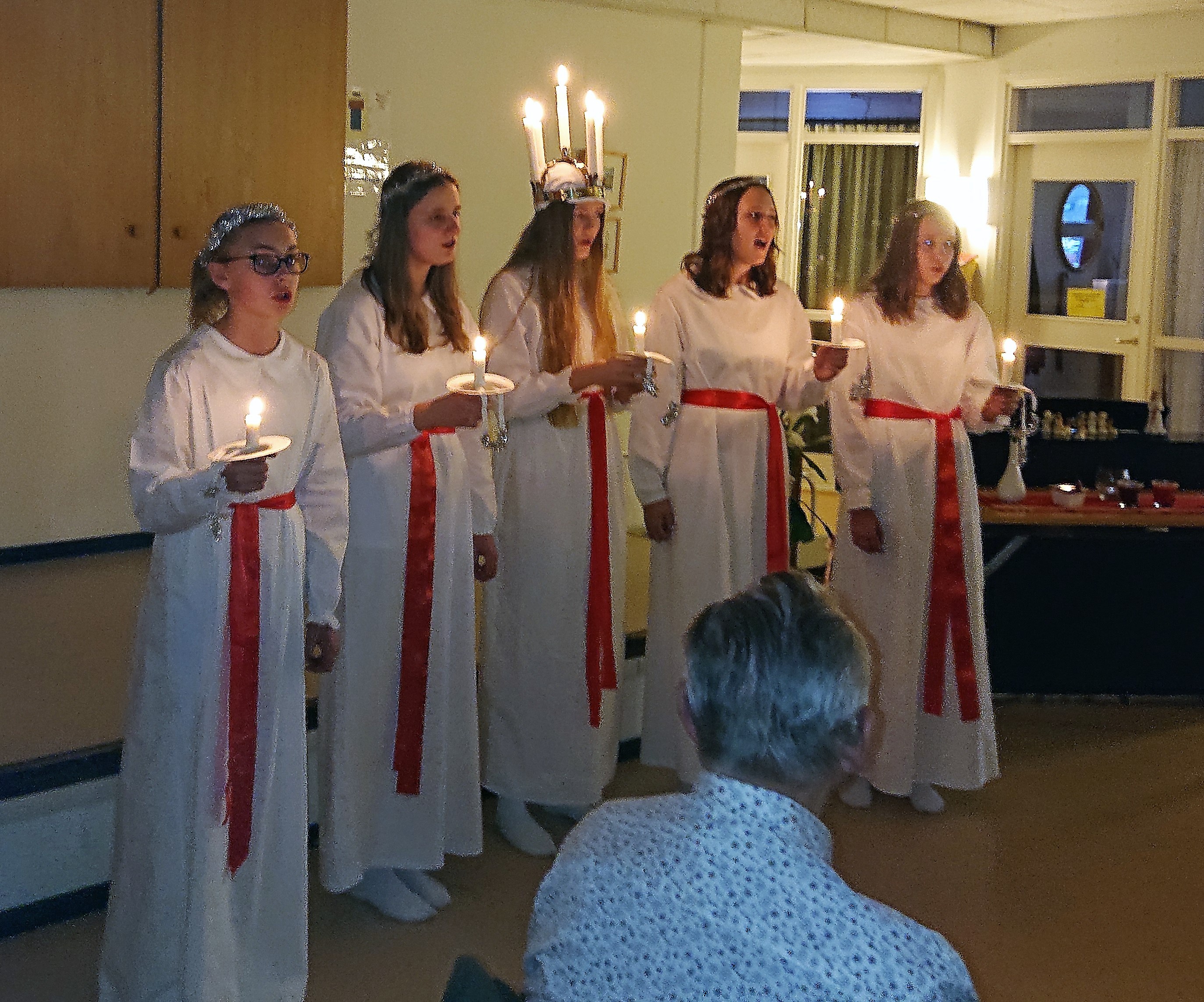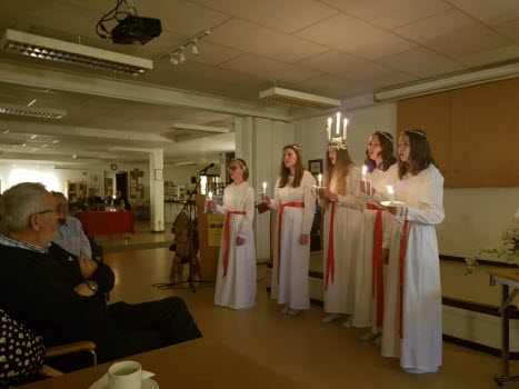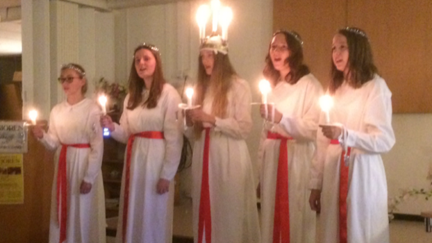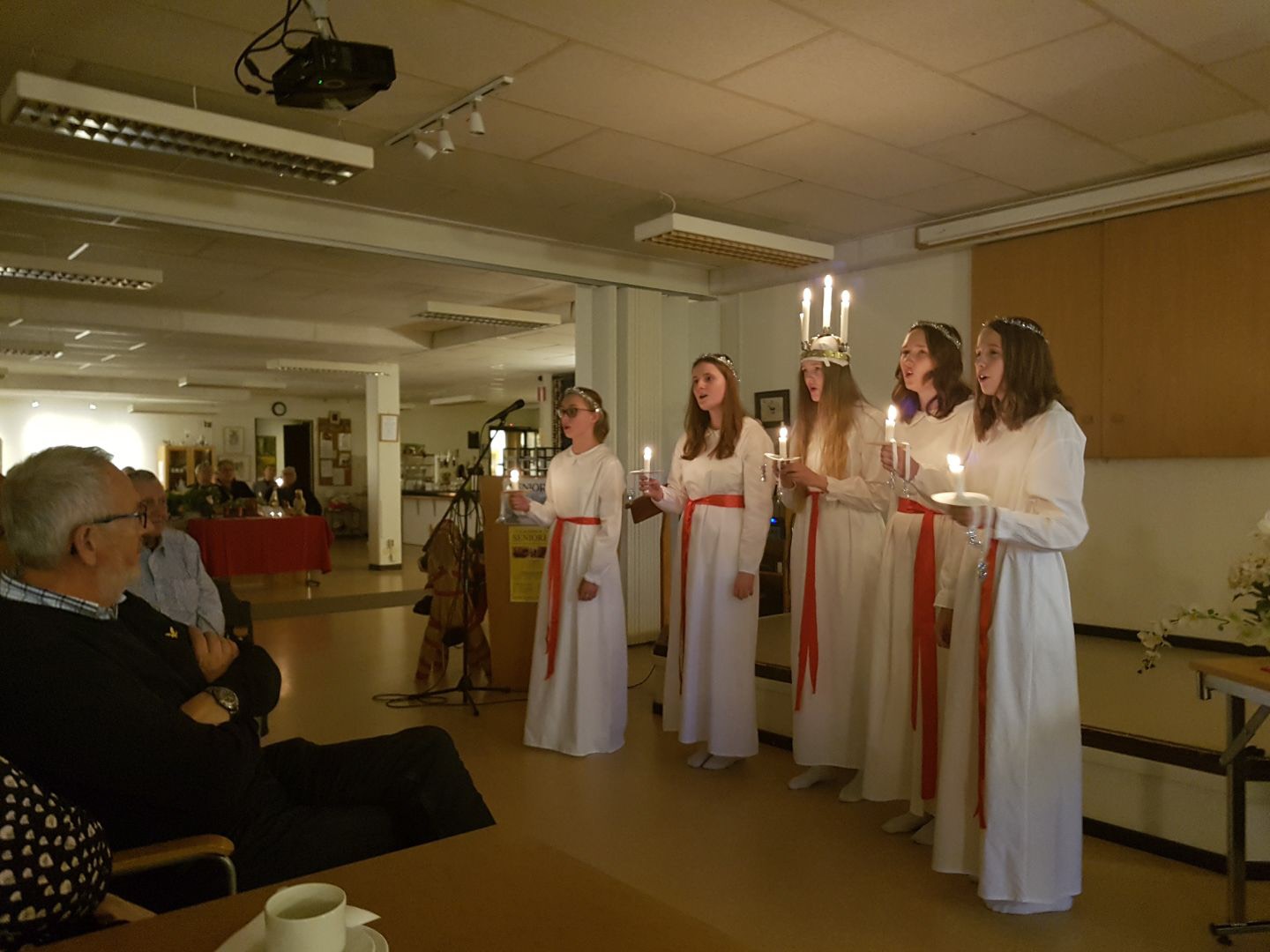 Lucia med tärnor. Alice Nordbjörk, Felicia Glimmergård, Lina Grönvall, Bella Segerham och Sigrid Grimberg.