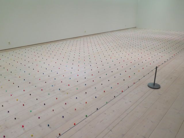 Ovan en "annorlunda tavla" på golvet. Många små "ploppar" som var placerade efter ett förutbestämt mönster.