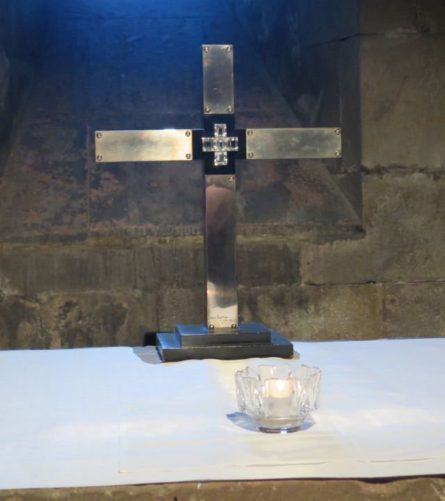 Korset är tillverkat av silversmeden Wiwen Nilsson och är placerat i kryptan.