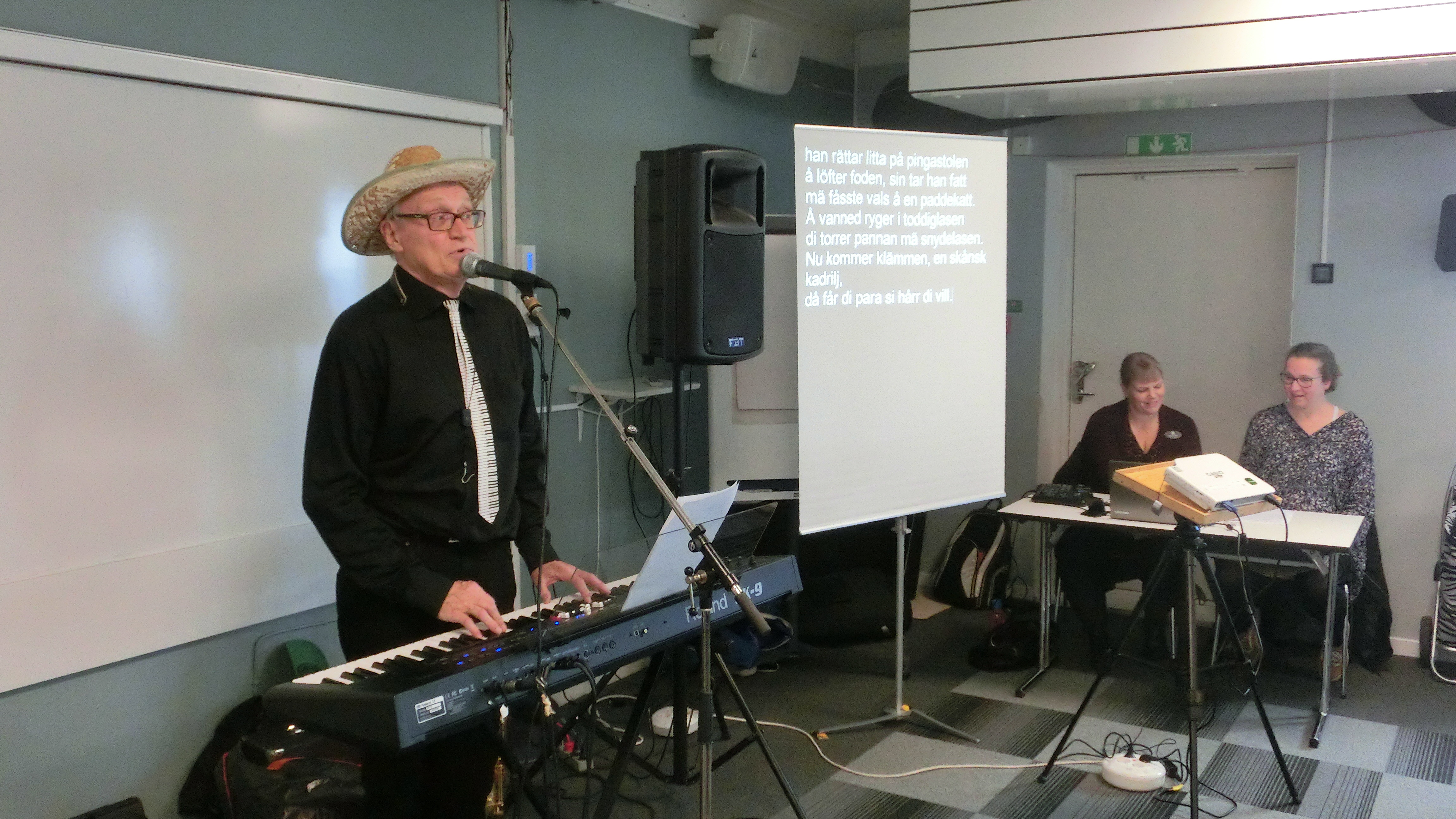 Måndagen den 28 oktober hade vi månadsmöte på Smygehus Havsbad. Stig Moberg, musiklärare från Skurup, underhöll i en timme med sång och komp från sin musikmaskin. Han berättade också lite historier. Camilla och Malin från Tolkcentralen textade så alla kunde följa med.