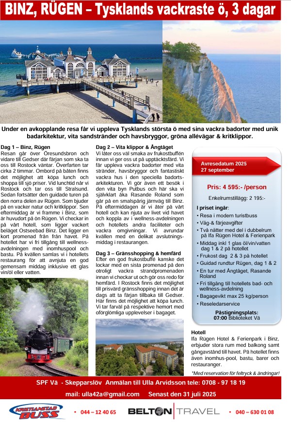 Ansvarig för resor: Ulla Arvidsson Tel: 0708-971819 E-post: ulla42a@gmail.com.