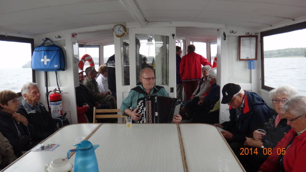 På väg ut på Ivösjön - Sven-Erik Ohlsson från PRO Nymölla/Gualöv underhöll på dragspel och det serverades dricka och snacks.