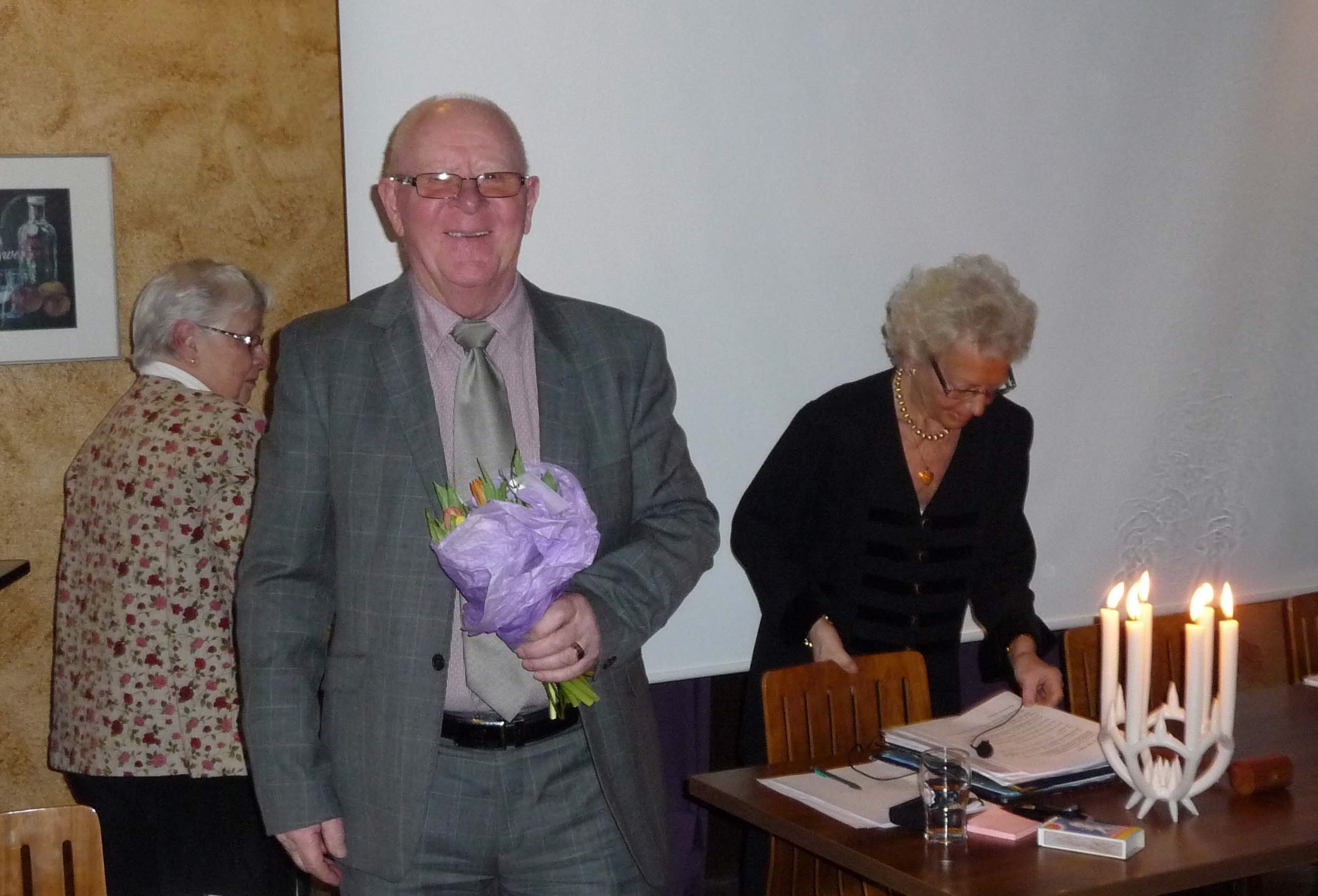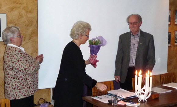 Sven-Erik Bengtsson fungerade som ordförande under årsmötet och avtackades med blommor av Birgitta.