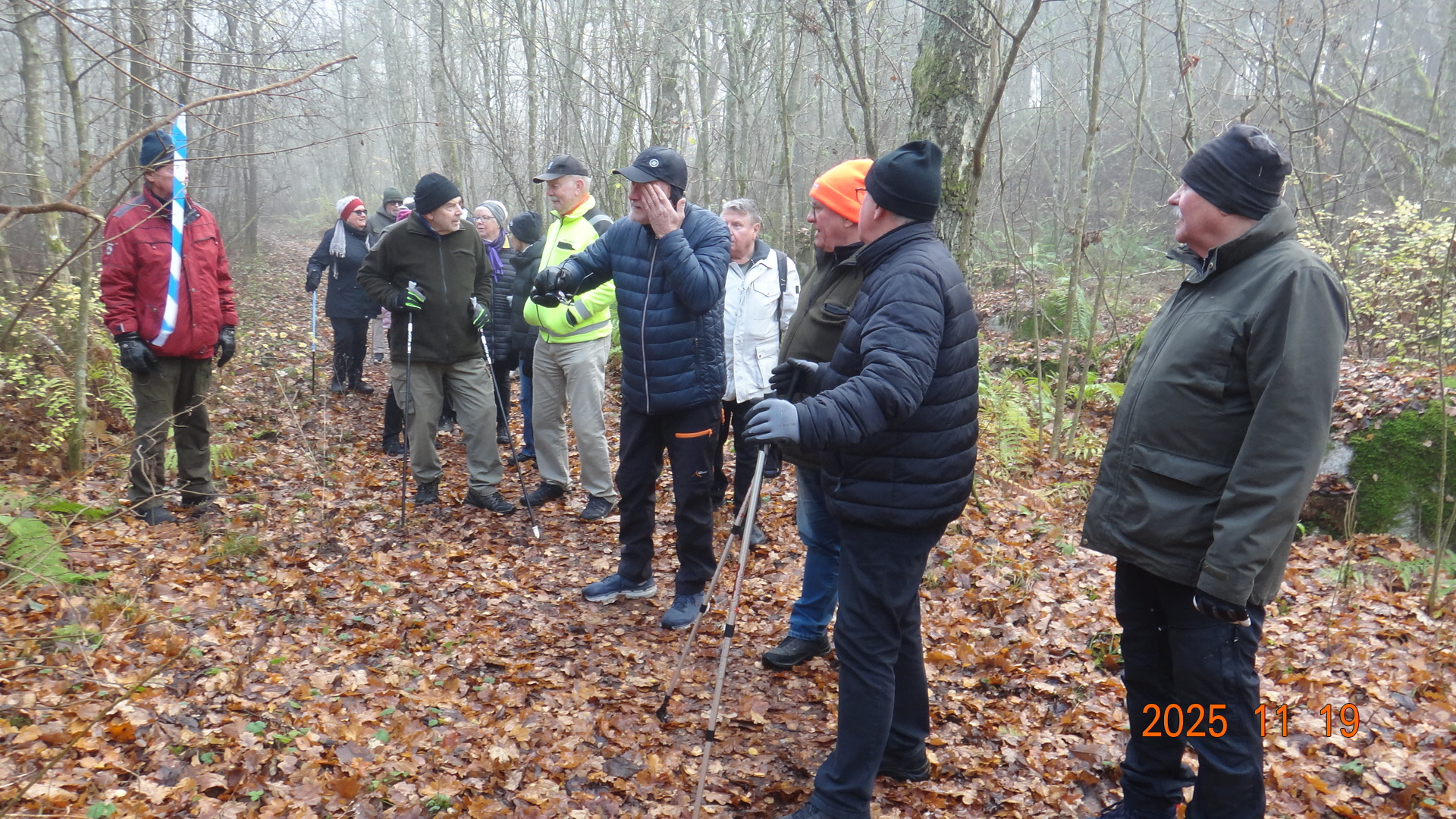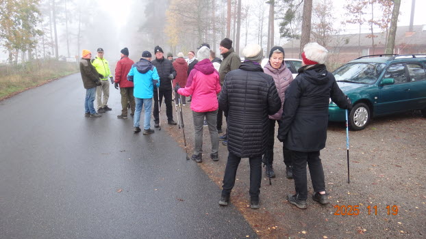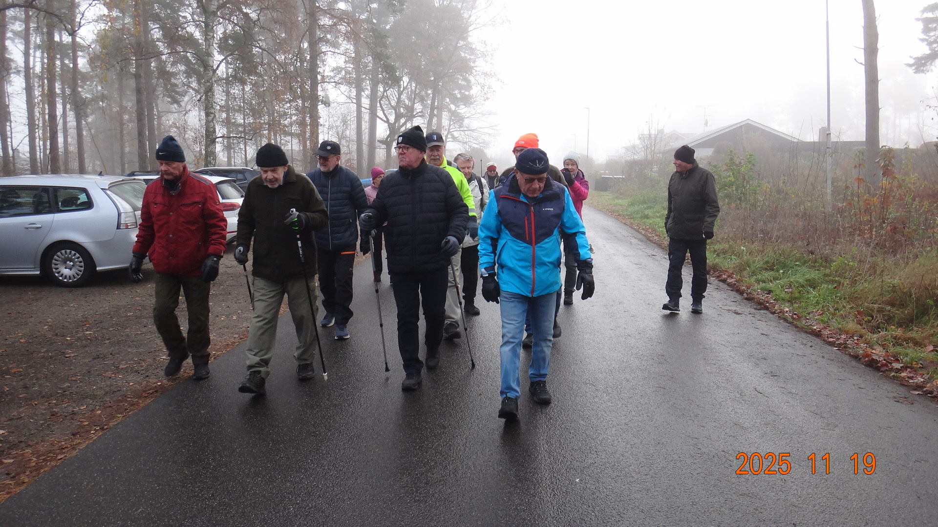 Det var en lite ruggig förmiddag med dimma, 0-gradigt men nästan vindstilla. Vi samlades på Strandängen och gick en 4,2 km lång runda i skogen. Pelle ledde oss 20 som trotsade halkan.