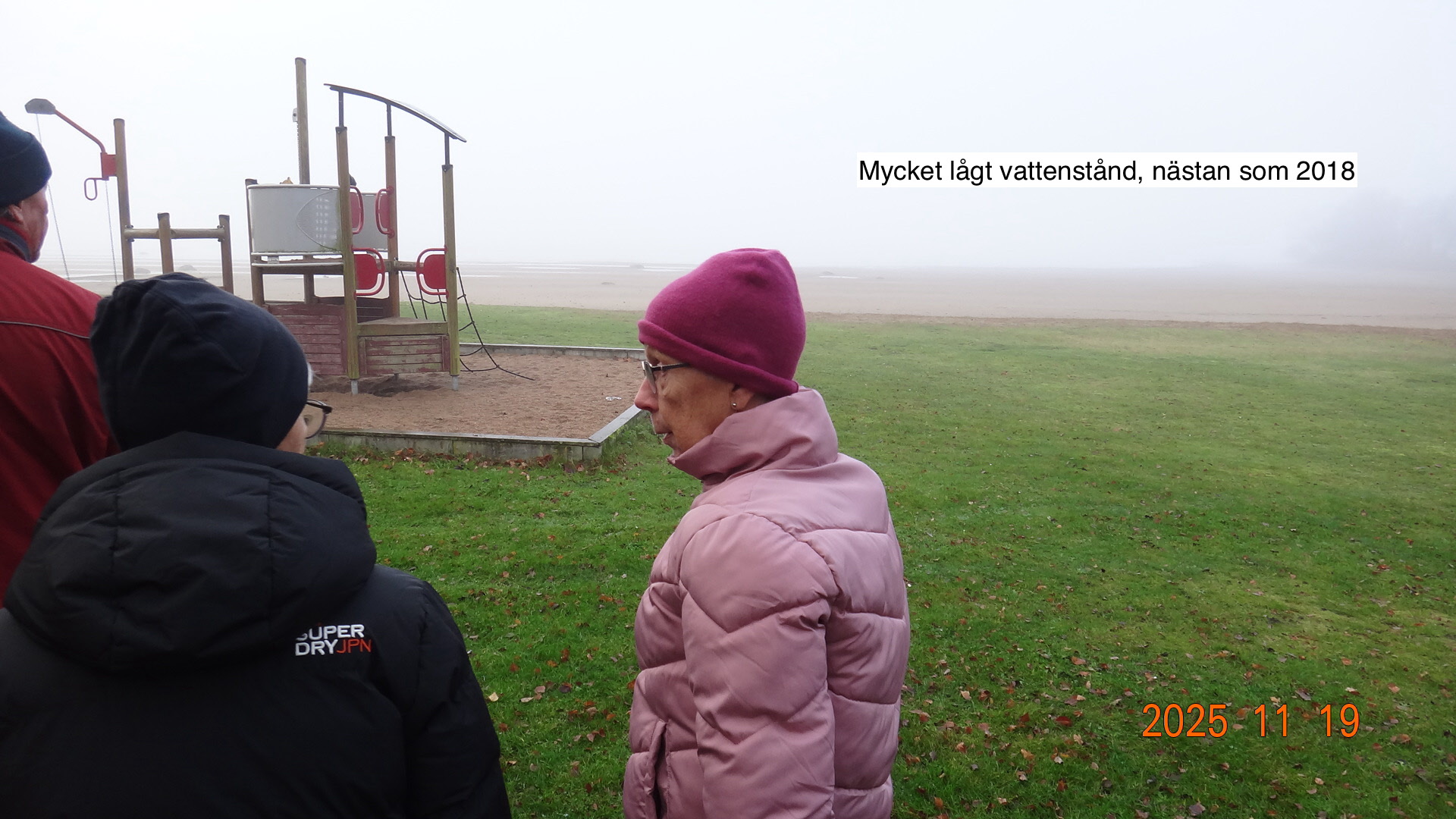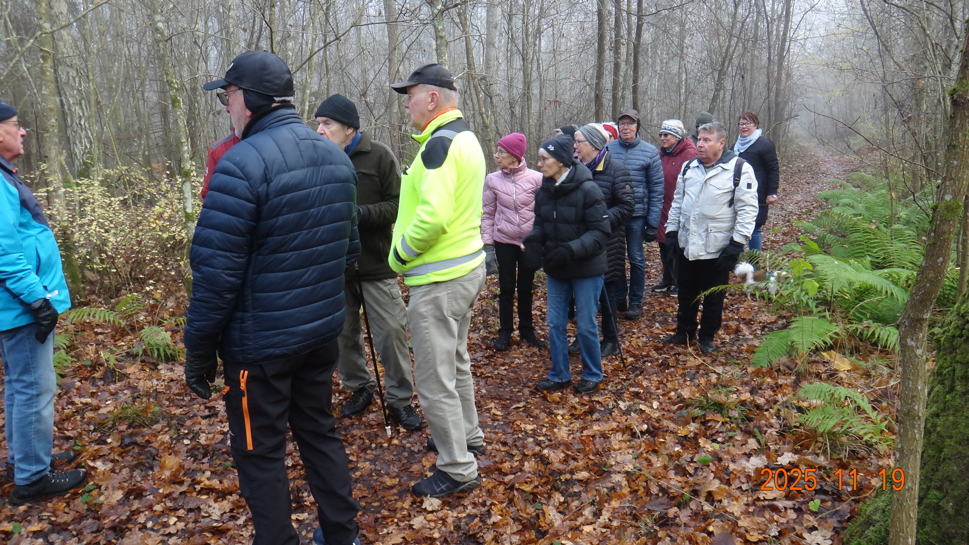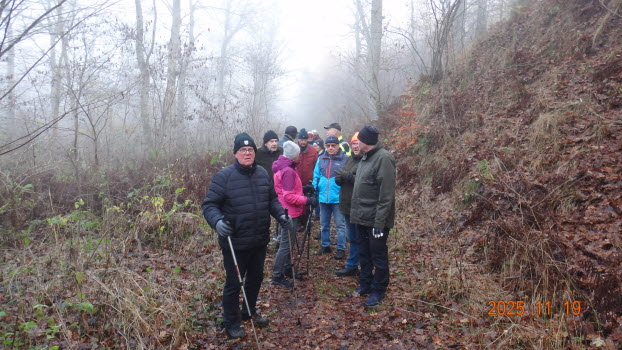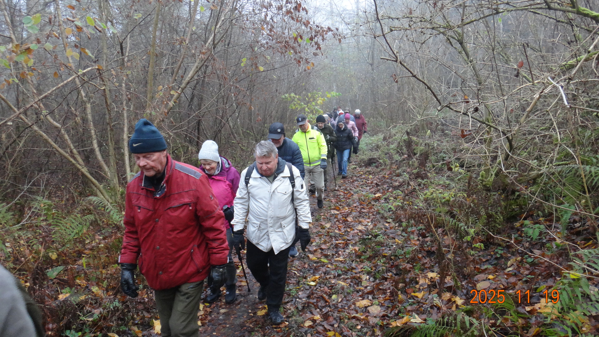 Det var en lite ruggig förmiddag med dimma, 0-gradigt men nästan vindstilla. Vi samlades på Strandängen och gick en 4,2 km lång runda i skogen. Pelle ledde oss 20 som trotsade halkan.