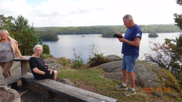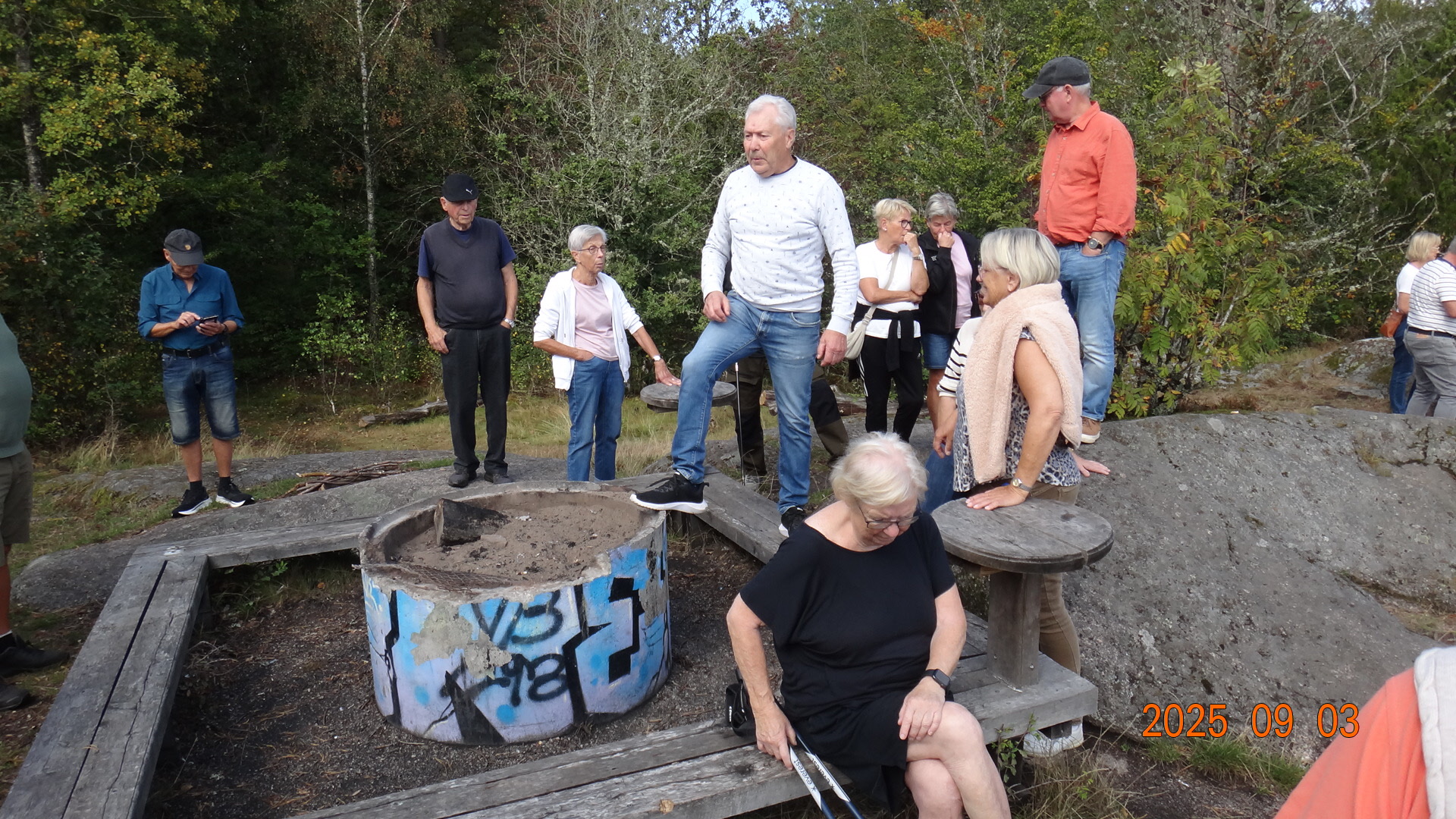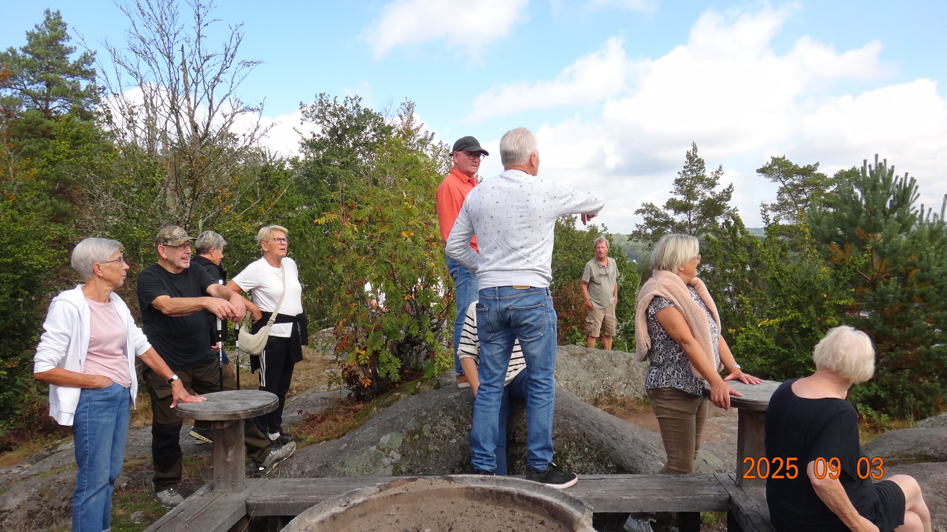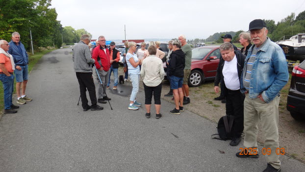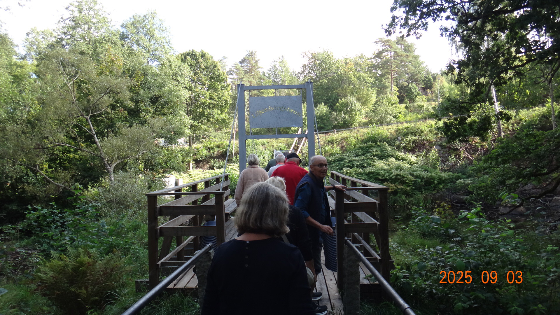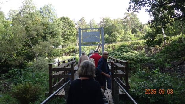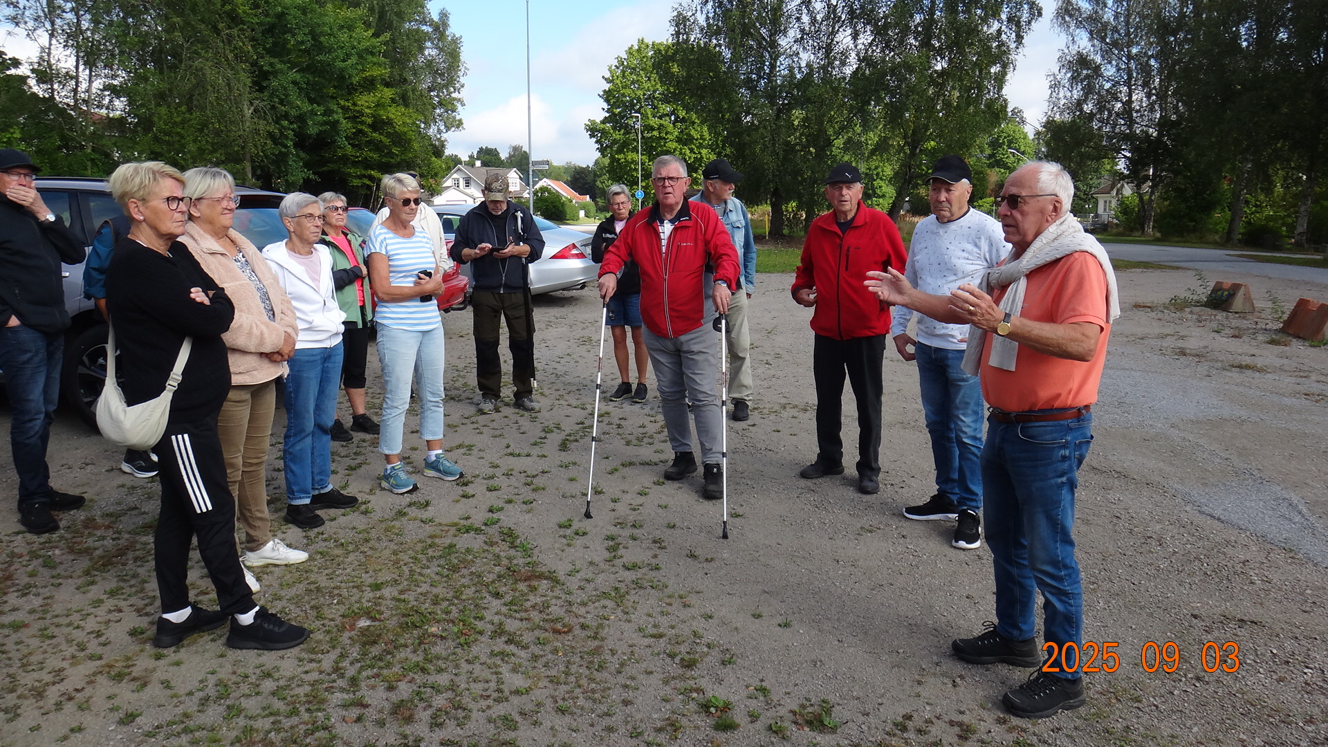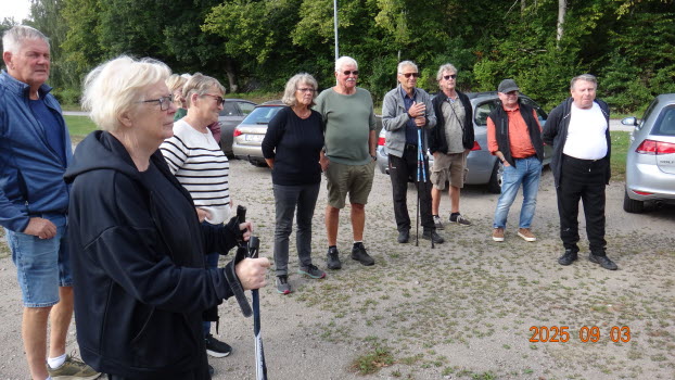 Efter samling i Småbåtshamnen samåkte vi till Kylingekorset, där Sven-Erik Larsson guidade oss till Folkhögskolan i Jämshög. Där gick vi över Holjeån på en hängbro. Tillbaka till bilarna körde vi Valhall ättestupa med sin vackra utsikt över sjön Orlunden. Vädret var halvklart, måttlig västlig vind och 20-22°C. Hemfärden gick via Ekne Gårdsbutik för lite shopping. Vi var 27 st.
