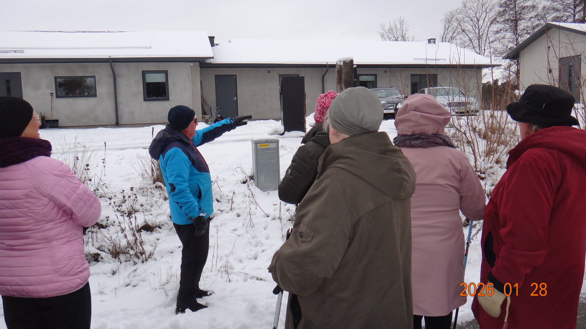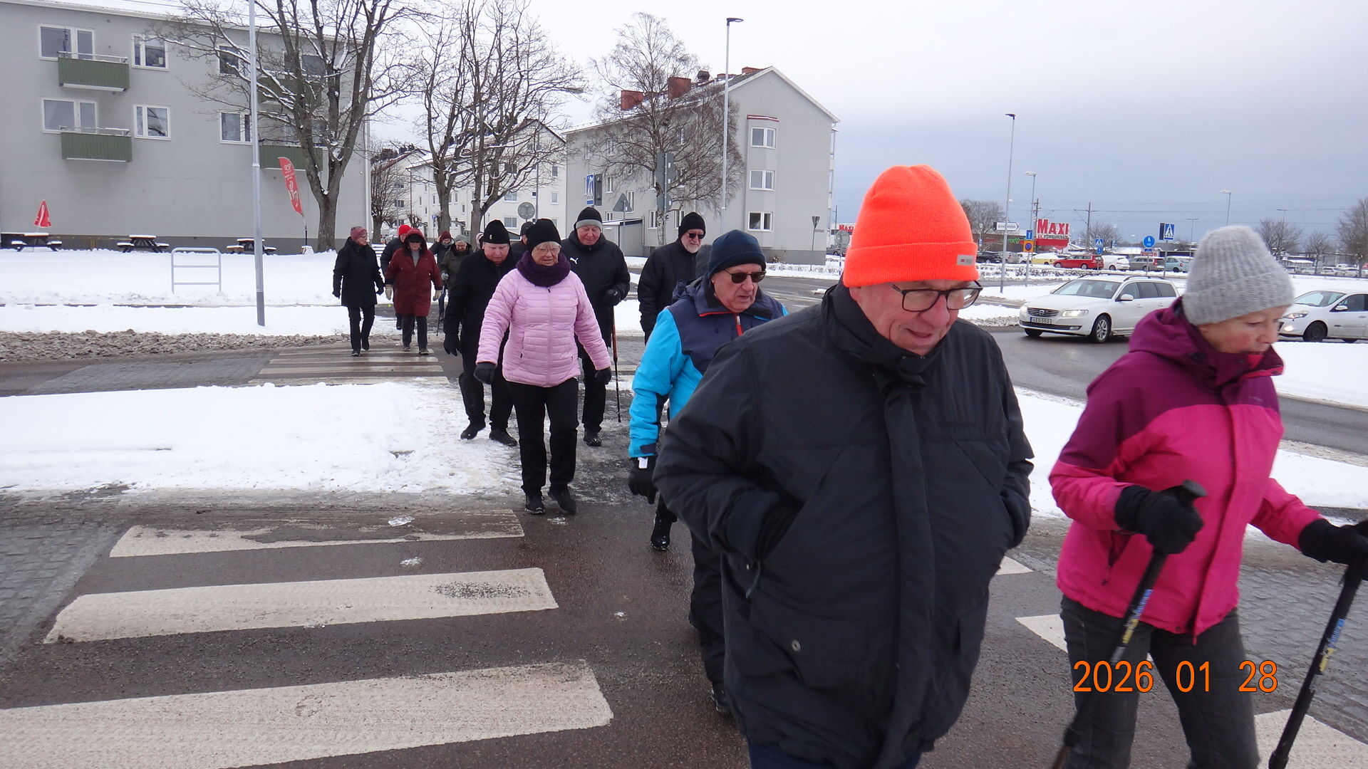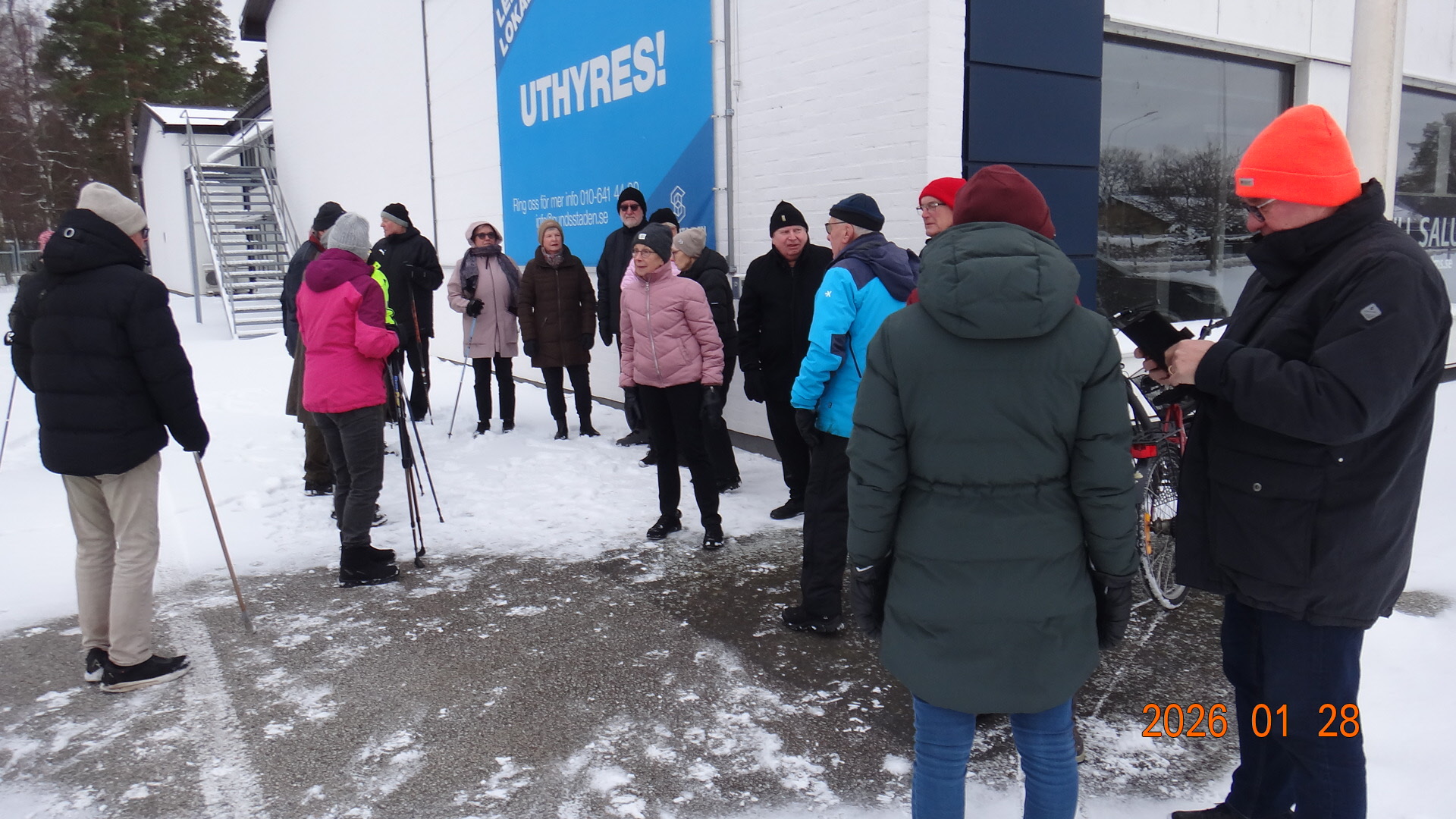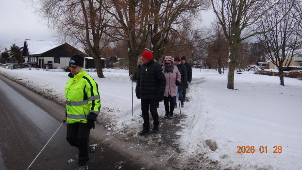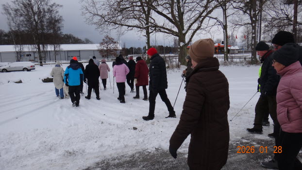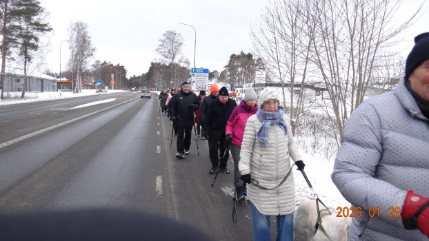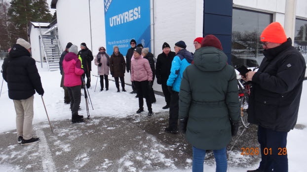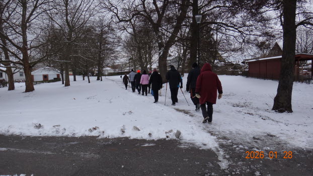 Vi samlades vid Möbelaffären. Trots -2°C som kändes som -8°C kom det 23 medlemmar för att gå........ förbi Lidl...... under järnvägen till den nya rondellen........gångstigen bort till Ripps........Sparbankshallen........ Vita Sand...........Pynten.......Skogsvägen och tillbaka till Möbelaffären. En sträcka på ca 3,7 km.