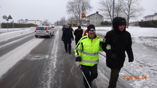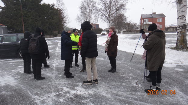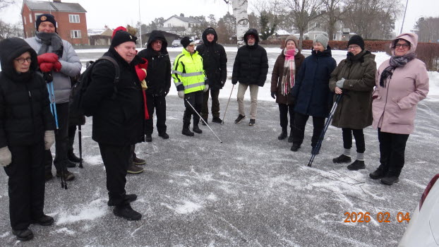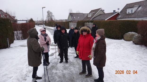 Ännu en onsdag med riktigt vinterväder. -4°C som kändes som -10°C och mycket blåsigt med lätt snöfall. 14 medlemmar kom ändå till samlingsplatsen, som var Folkets hus. Därifrån gick en slinga på ca 2,8 km genom Fäladen.