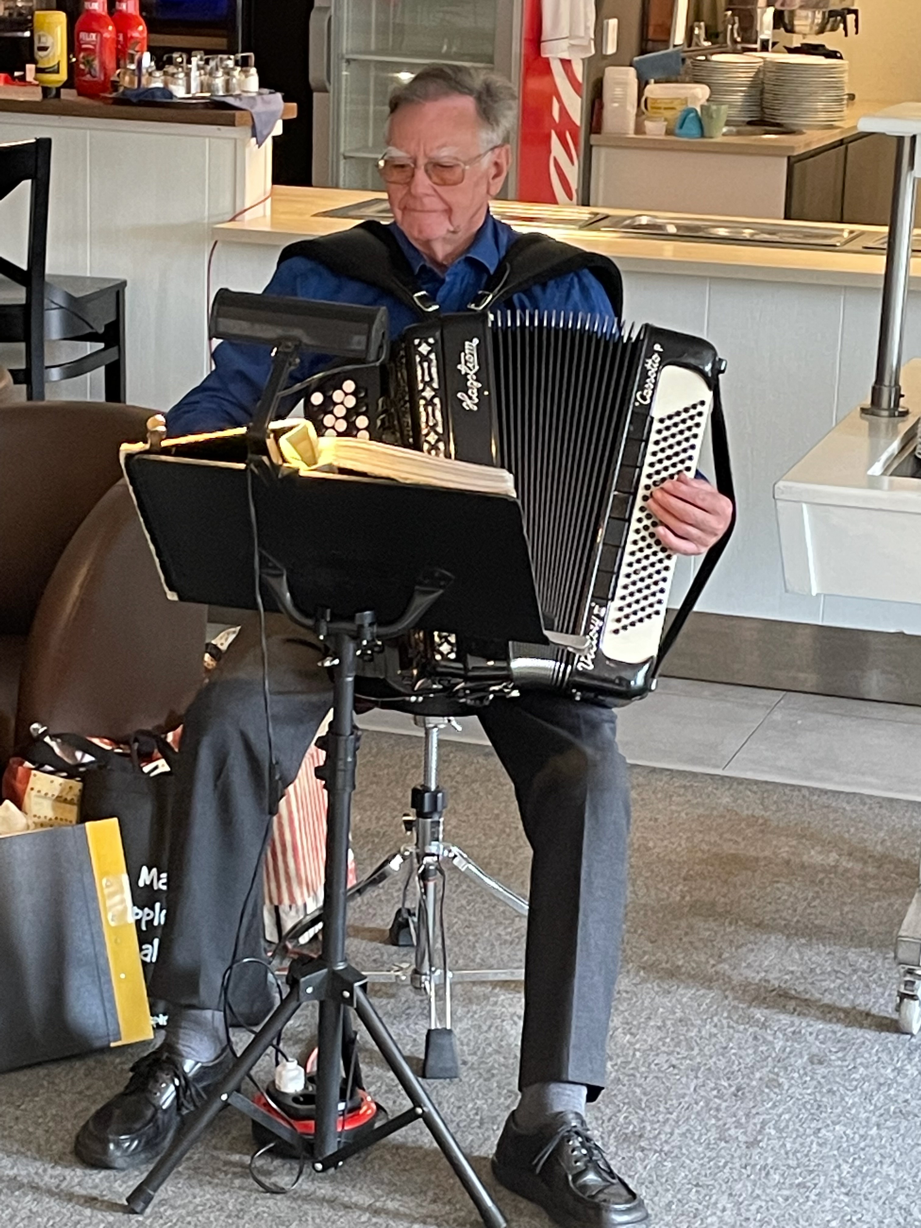 Idag söndag höll SPF Seniorerna Degeberga söndagsmiddag för dem över 80. En trevlig tillställning med god mat o fin service på Mjelarasten i Degeberga. I pausen mellan huvudrätt och dessert underhöll Gunnar Persson oss med dragspelsmusik och allsång.
