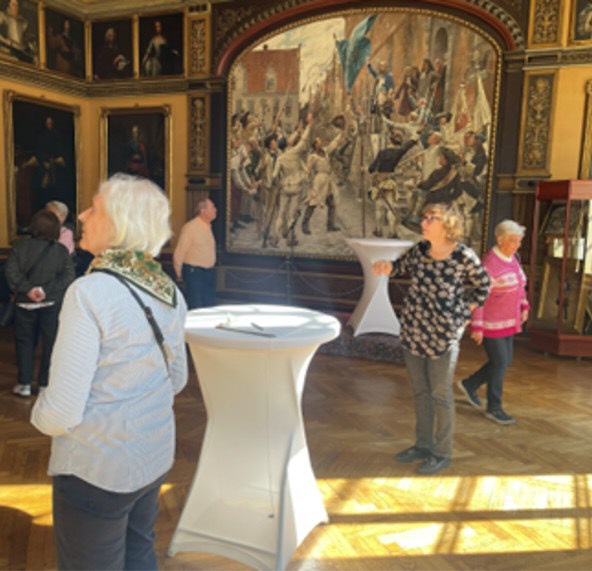 Landstingssalen nästa anhalt. 1709 talade Magnus Stenbock till folket från trappan i Malmö i väntan på danskt anfall. Gustav Cederström målade tavlan 1889 och han målade också den välkända tavlan kung Carl XII:s likfärd. Carina berättade också om några av de danska kungaporträtten som hänger i salen.