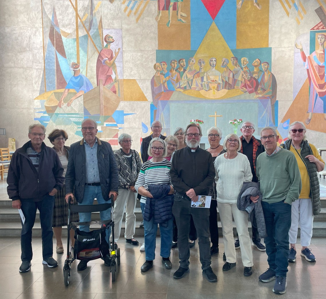 Han började med att berätta om församlingen Slottstaden med en historisk återblick. Församlingen behövde en egen kyrka. Arkitekterna T Roos och B Thornberg ritade kyrkan där bygget startade 1955 och invigningen skedde 1959. Dagens kyrka beskrevs med alla sina detaljer och under en rundvandring i kyrkorummet fick vi ytterligare information om olika utsmyckningar och blyinfattade fönster och krucifix.