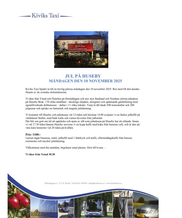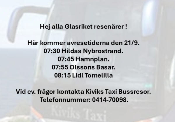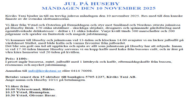 Anmälan till info@kivikstaxi.se eller 0414 70098.