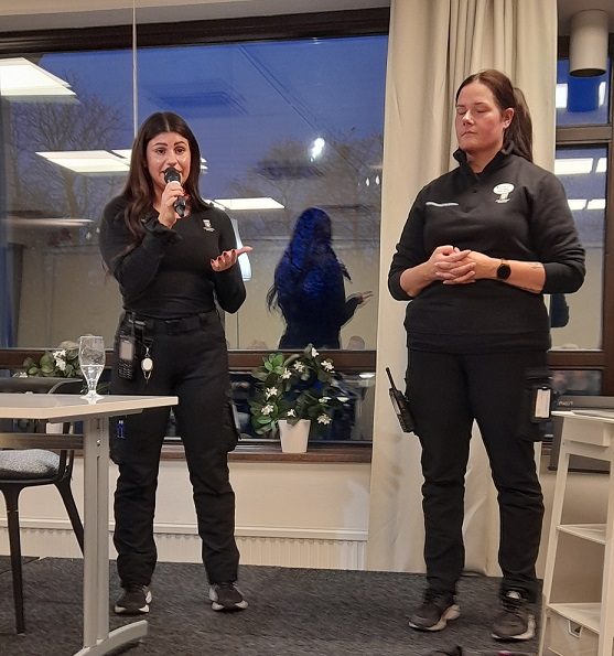 Det var nu dags för kvällens gäster att inta scenen och berätta och visa bilder om sitt arbete som trygghetsvärdar inom kommunen! Befattningen som trygghetsvärd tillkom 2018 då Trelleborgs kommun beslutade att anställa ett antal trygghetsvärdar för att minska brottsligheten och öka tryggheten inom kommunen. Trygghetsvärdarna är i tjänst varje dag under hela året och samarbetar med bl.a. polisen, räddningstjänsten, socialtjänsten, vaktbolag, företag och föreningar, skolor och fritidsgårdar. Möjlighet finns även att använda den s.k. ”nattknappen”, som innebär att trygghetsvärden håller dig sällskap i telefonen mellan kl 21.00 och 02.00 om du känner dig otrygg när du är hemma eller på väg någonstans på kvällstid! Resultatet av deras arbete uppvisar att den senaste trygghetsmätningen inom kommunen är den bästa på över 10 år!