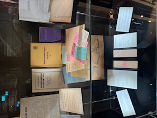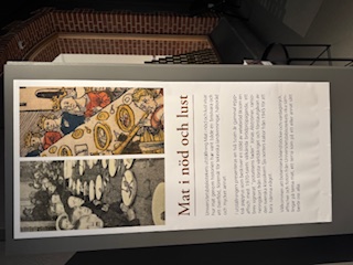 I UB:s nya utställningssal såg vi ”Mat i nöd och lust” (Bild 1). Här visas i olika montrar hur mat genom tiderna varit en bristvara och ett överflöd, Ransoneringskort och recept på chokladkakor skrivna av fångar i Ravensbrück. De utsatte sig själva för stor fara genom att i hemlighet bevara vad som en gång varit (Bild2 ). Reklamblad för bröd och glass ses på bilderna 3 och 4.Trevlig och informativ utställning väl värt ett besök.