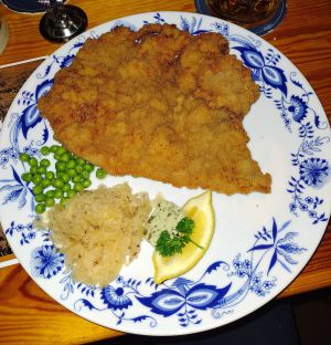 Sedan dags för wienerschnitzel med tillbehör. Schnitzeln lade beslag på halva tallriken. Rikligt med andra ord. Och som sig bör: apfelstrudel till dessert.