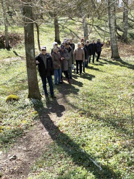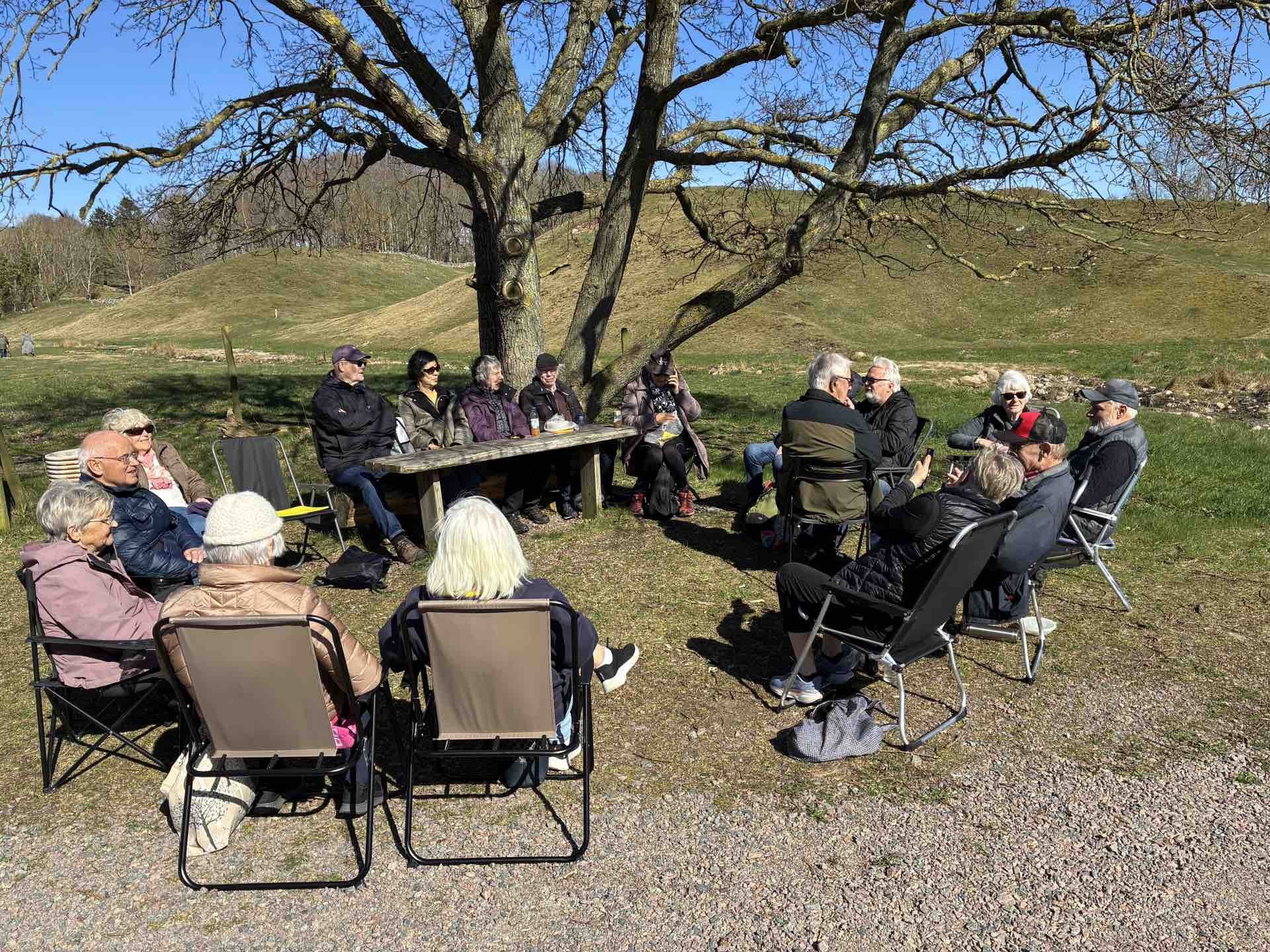 Efter en stunds promenad delade vi oss i två grupper, en del ville gå upp på ledens högsta topp för att njuta av utsikten, de övriga tog en skön promenad i den lägre terrängen och fick se en nästan utslagen björk. Vi återförenades för en gemensam vandring tillbaka till det väntande kaffet.