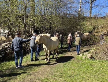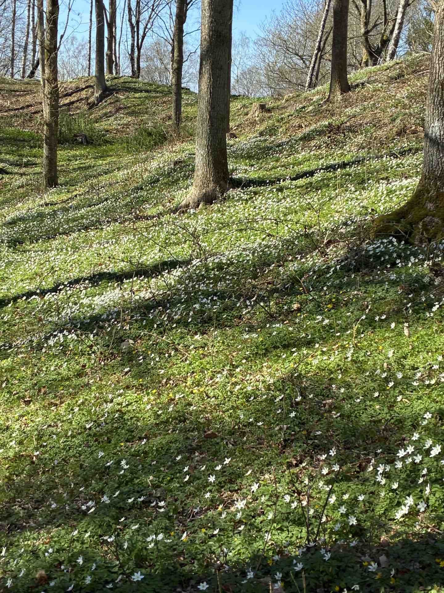 Vi tog oss över stättan, in i den spirande skogen och där fanns vitsippor, blå scillor och gul vintergäck. Vi följde den blåmarkerade leden och helt plötsligt mötte vi två hästar som var på vandring åt andra hållet.