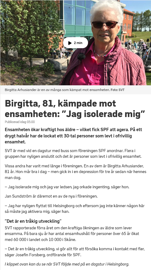 Länk till reportaget som ligger på SVTs hemsida till den 9 maj. https://www.svt.se/nyheter/lokalt/helsingborg/birgitta-81-kampade-mot-ensamheten-jag-isolerade-mig |