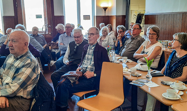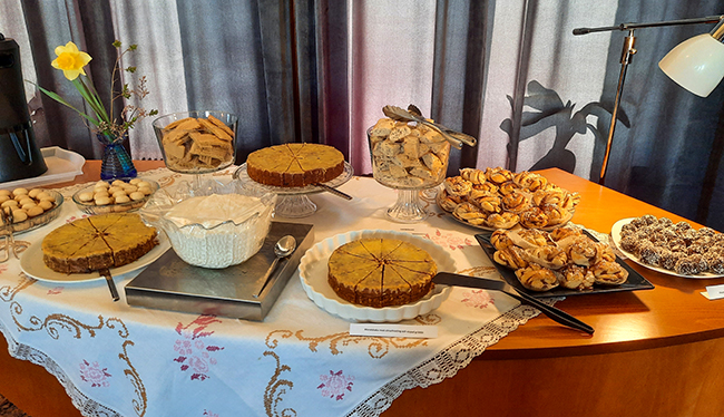 I caféet hade man dukat upp en härlig kakbuffée med bullar, ambrosiakaka, makroner, chokladbollar m m plus fruktfat. Och så blev vi serverade det exklusiva Walters Kaffe som framställs i Landskrona.