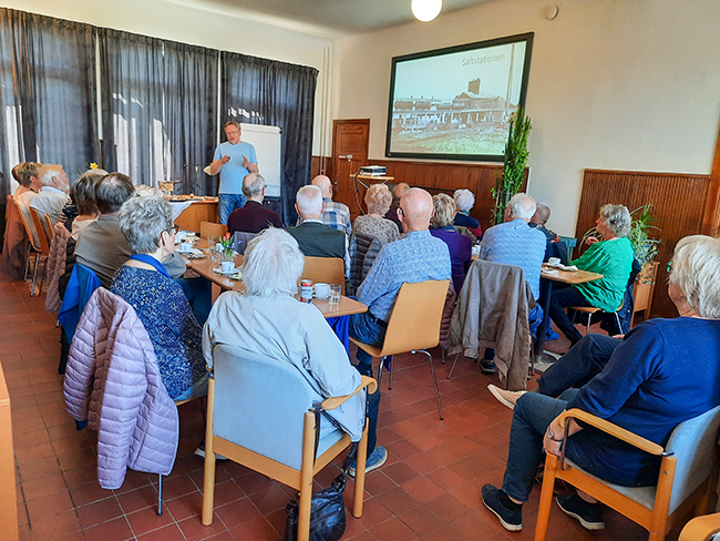 Genom det vackra jordbrukslandskapet passerade vi Ekeby (utan stopp dock), vidare till Kågeröd och Svalöv och så till Teckomatorp. Där möttes vi av ytterligare några SPF-are som kört i egna bilar samt av Hans Tapper som äger Stationen med Café och Bistro plus ett konstgalleri och en shop med allt från ljus, parfym och tvål till kakor och bröd.