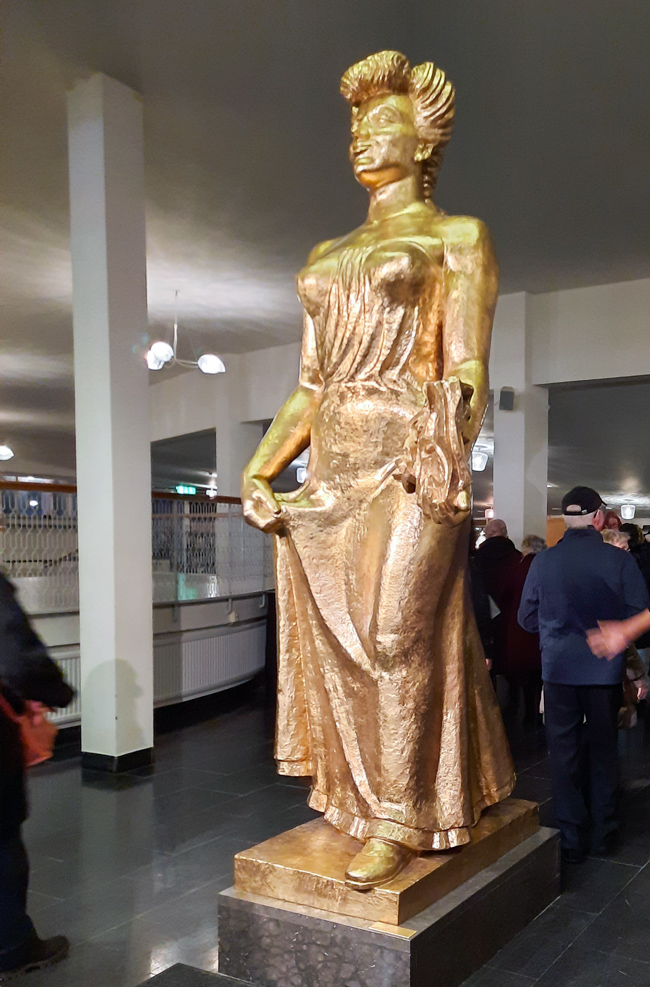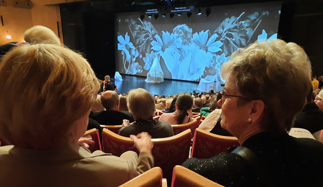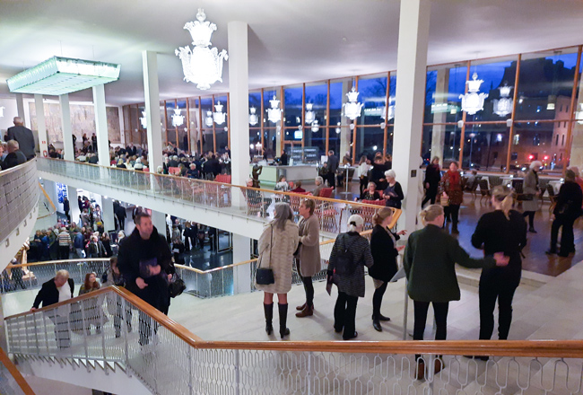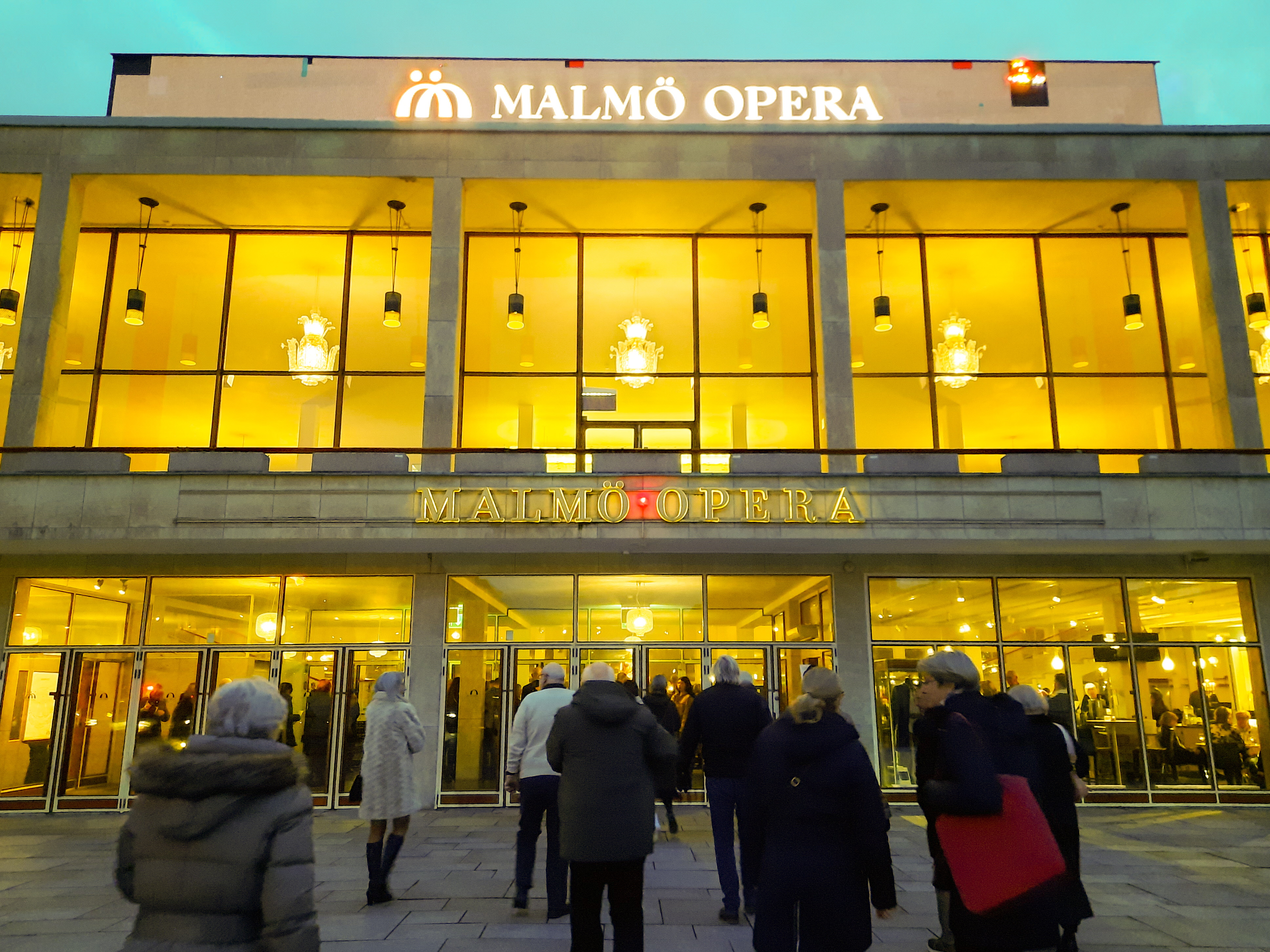Vi kom till Malmö i god tid och kunde njuta av atmosfären i denna otroliga byggnad. Malmö Stadsteater, som den då hette, byggdes under andra världskriget och den invigdes 1944. Byggnaden ritades av tre berömda arkitekter med Sigurd Lewerentz i spetsen. Han har också ritat Sankt Petri kyrka i Klippan. När vi hade kollat in vid vilket bord vi skulle få pausfikan, ringde det in och vi bänkade oss i salongen.