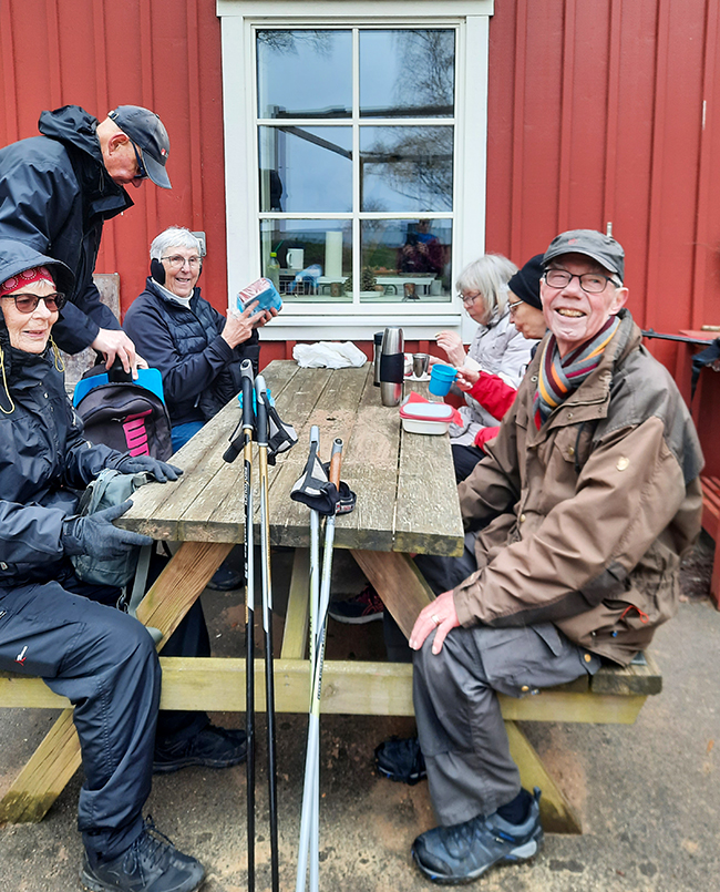 När vi närmade oss bebyggelsen igen fick vi tillåtelse att fika i Solvallens i Ur & Skur Förskola. Där satt vi bekvämt med bord och bänkar och lät oss väl smaka av medhavd fika. Därifrån var det inte långt tillbaka till stationen och tur var väl det för då började det småregna. Det var en fin vandring på ca 5 km då vi både fick uppleva bokarna som började slå ut och både gulsippor och vitsippor. Tack Johnny.