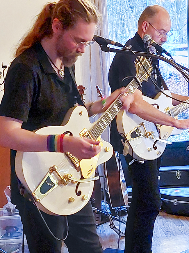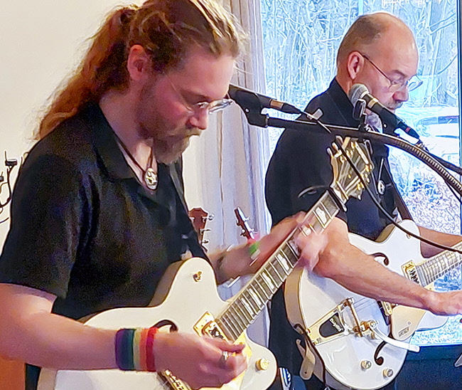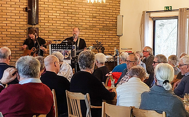 Till månadsmötet den 11 mars hade vi engagerat LINY´s musikduo, som bestod av far och son med varsin gitarr som de trakterade med den äran. Vi bjöds på olika sorters låtar - rock, visor, country, irländska sånger, danska kända låtar och internationella covers. Och när de till slut spelade Auld Lang Syne, den skotska folkvisan, fick de gitarrerna att låta precis som säckpipor. Så fint!