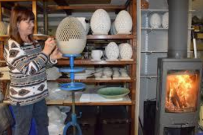 Sedan är det dags för att åka vidare till Sireköpinge Stengods. Där vi får se alster som är gjorda av Katarina Gustafson. Hennes favorit är lampor, lyktor, fat och skålar med genombruten dekor.