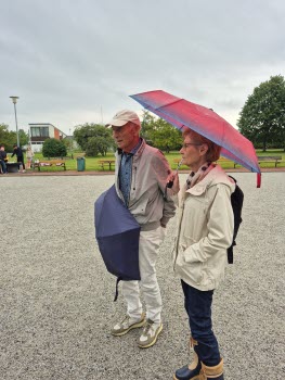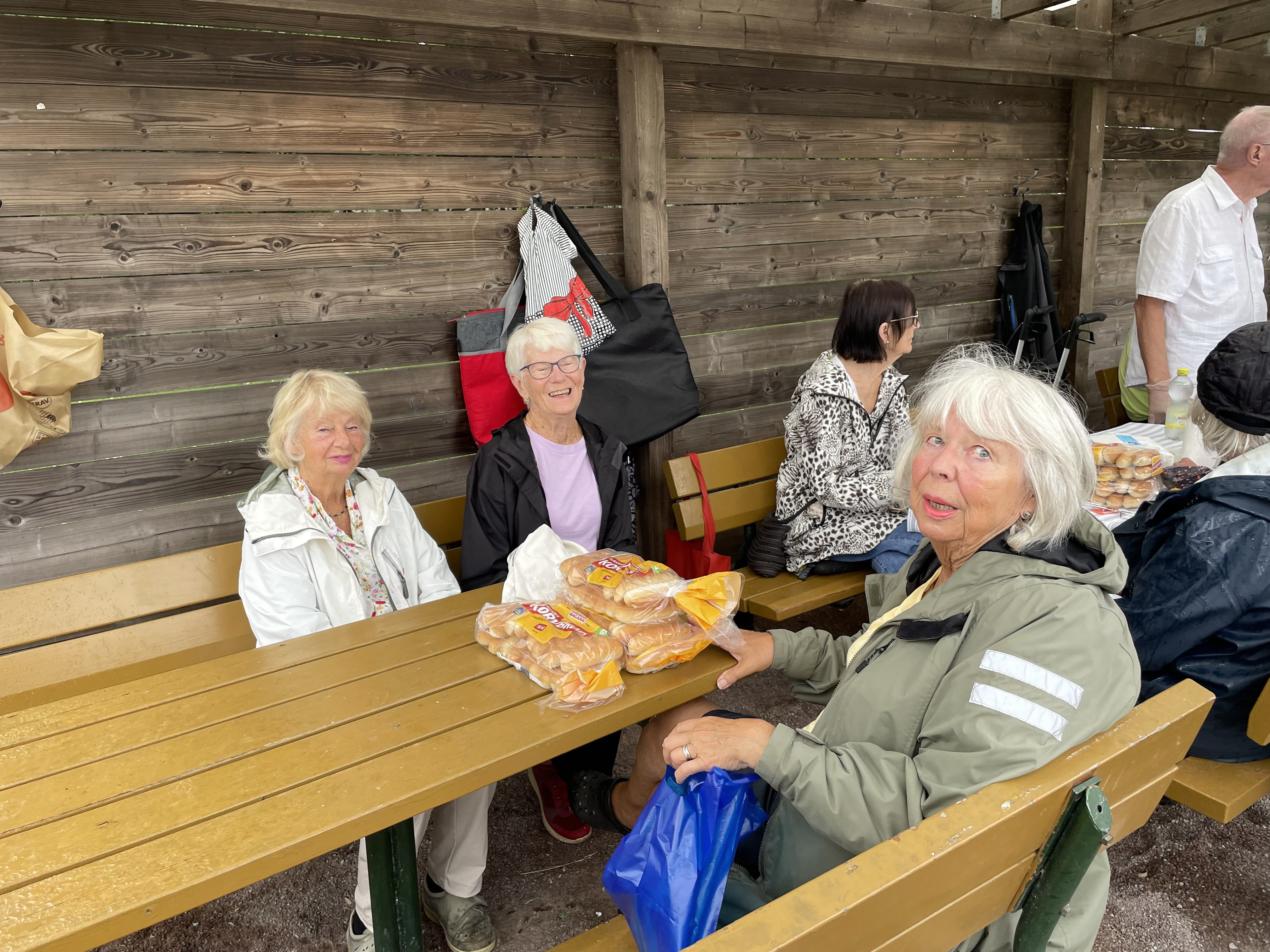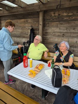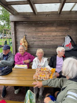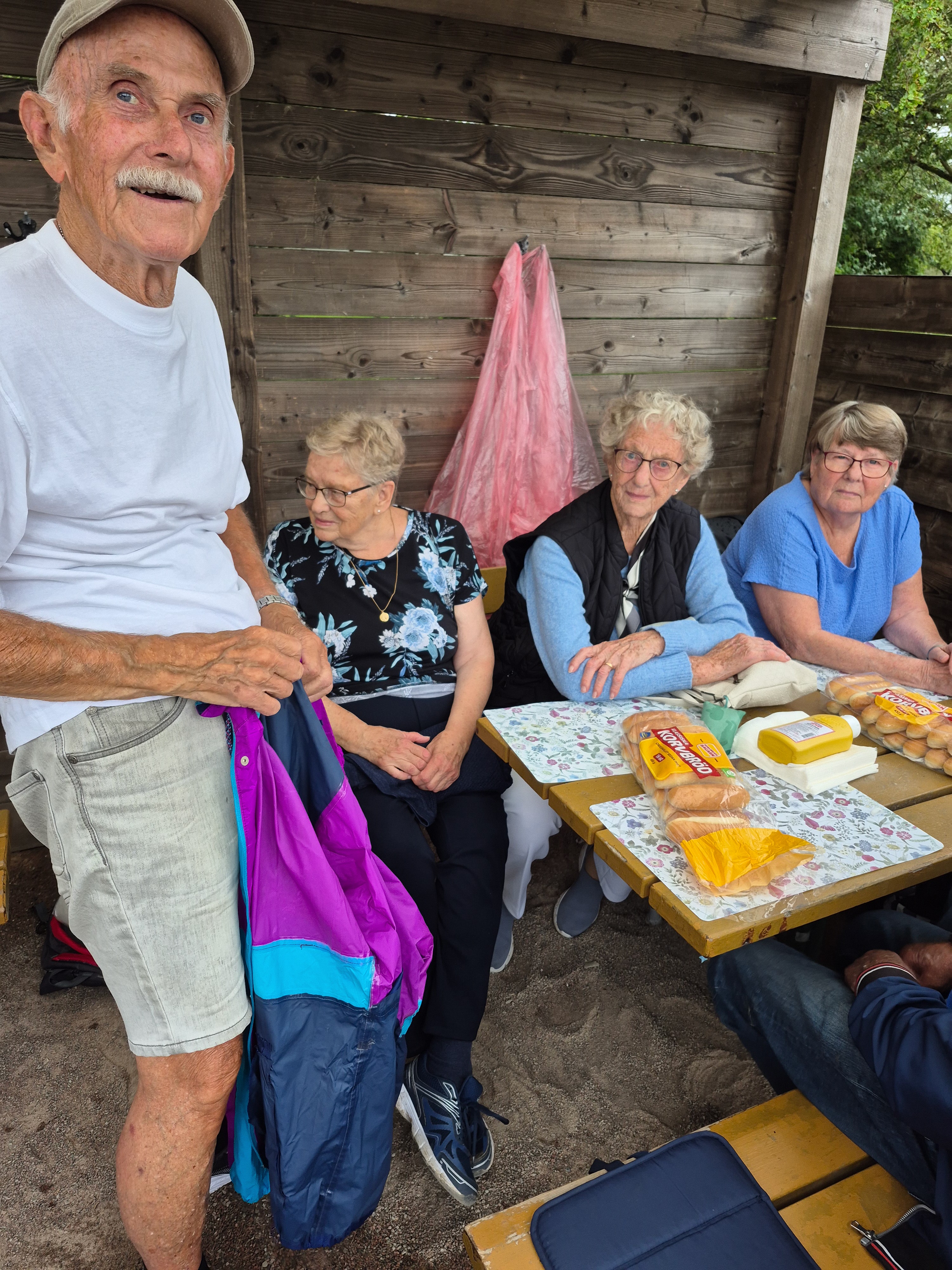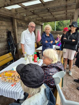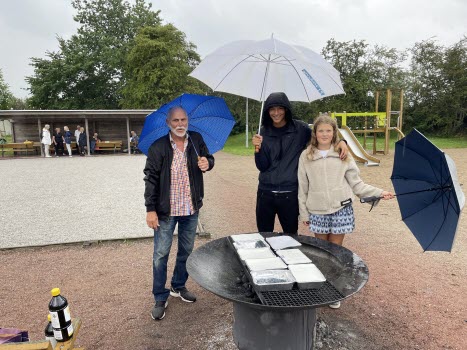 På den i särklass regnigaste eftermiddagen hittills i år träffades närmare 70 personer för att umgås med varandra. Korvarna hade en strykande åtgång och stämningen var hög. Vår grillmästare Kenneth med barnbarnen Sally och Victor höll igång glöden.