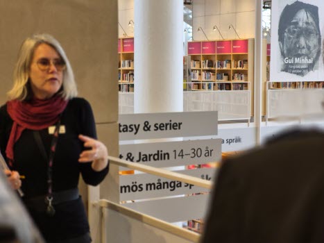 Guiden Nina Olsson gjorde rundvandringen och berättade om Stadsbibliotekets verksamhet