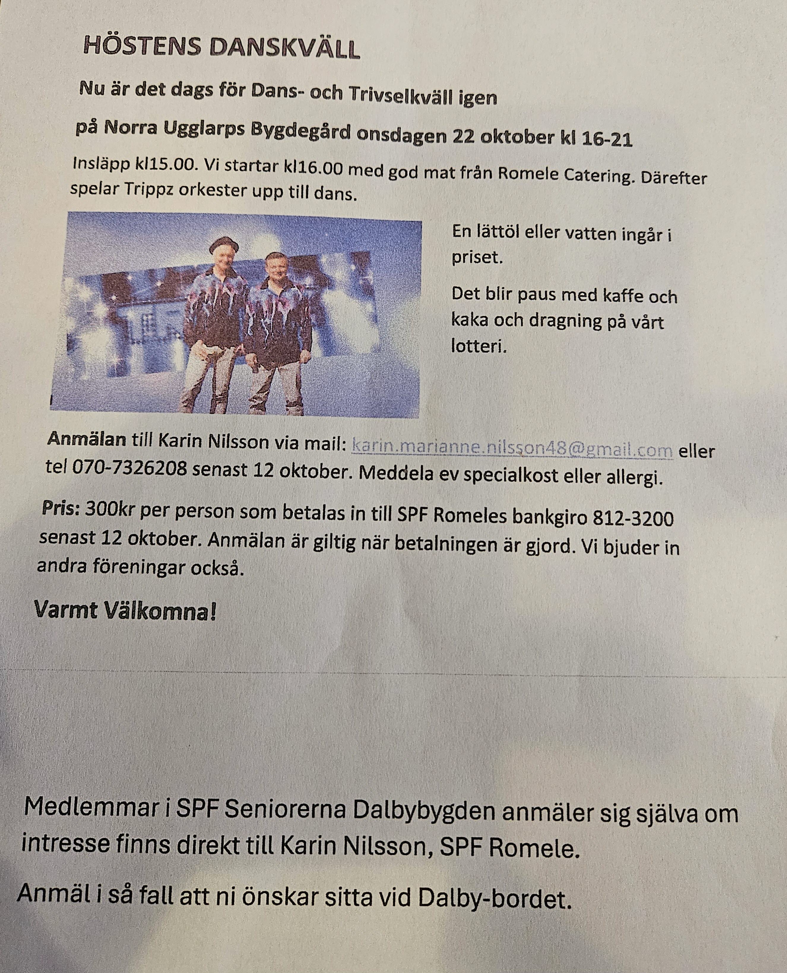 Insläpp kl 15.00. Vi startar kl 16.00 med god mat från Romele Catering därefter spelar Trippz orkester upp till dans. En lättöl eller vatten ingår i priset. Det blir paus med kaffe och kaka och dragning på vårt lotteri. Anmälan till Karin Nilsson via mail karin.marianne.nilsson48@gmail.com eller tel 070-7326208 senast 12 oktober. Meddela ev specialkost eller allergi.