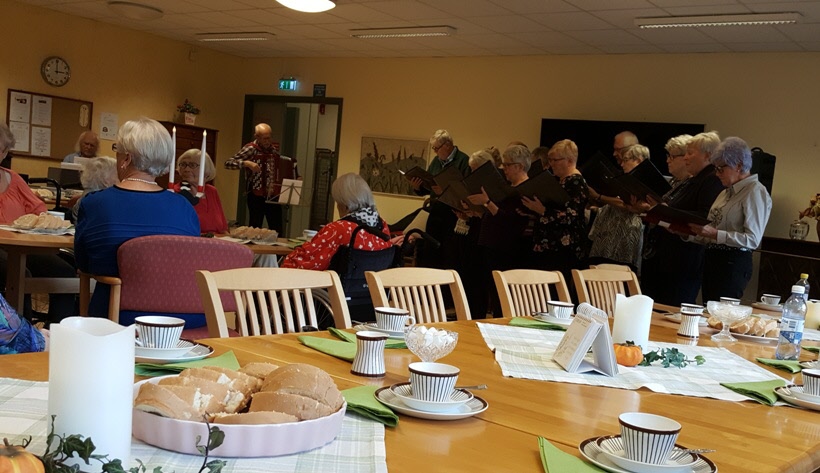 Ett stort antal boende samt ett 10-tal medlemmar i vår förening hade samlats runt kaffeborden för att bli underhållna med sång och musik av Sångfåglarna från Veberöd under ledning av Kaj Wirenbok. Ytterligare en Kaj ackompanjerade på dragspel.