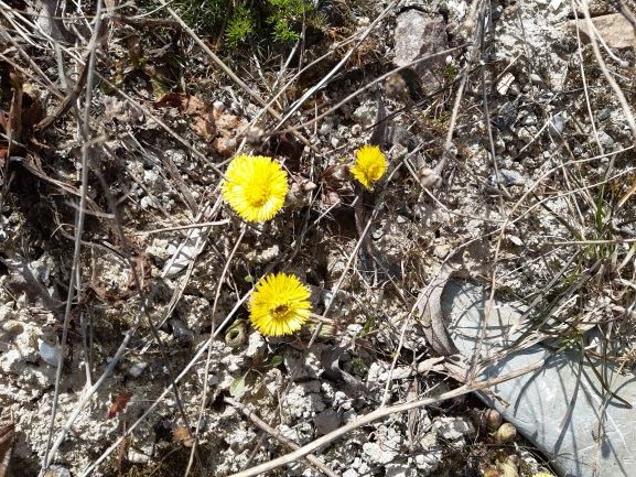 Promenaden den 25 mars gick till Påskagänget i bättre väder än föregående runda till samma område. På vägen dit gick vi förbi Alba och vid kanten av det som troligen ska bli ett litet parkområde fann vi de första Tussilagona för denna vår. Likt små solar sken de så vacker mot oss. Vi var sju personer som träffades idag, nu var ju all skidåkning på TV slut så det kändes bra med en promenad.