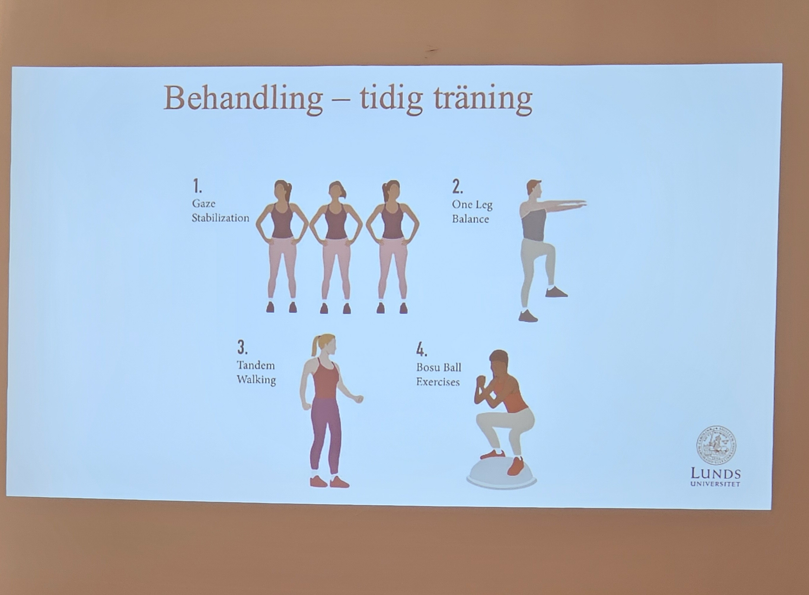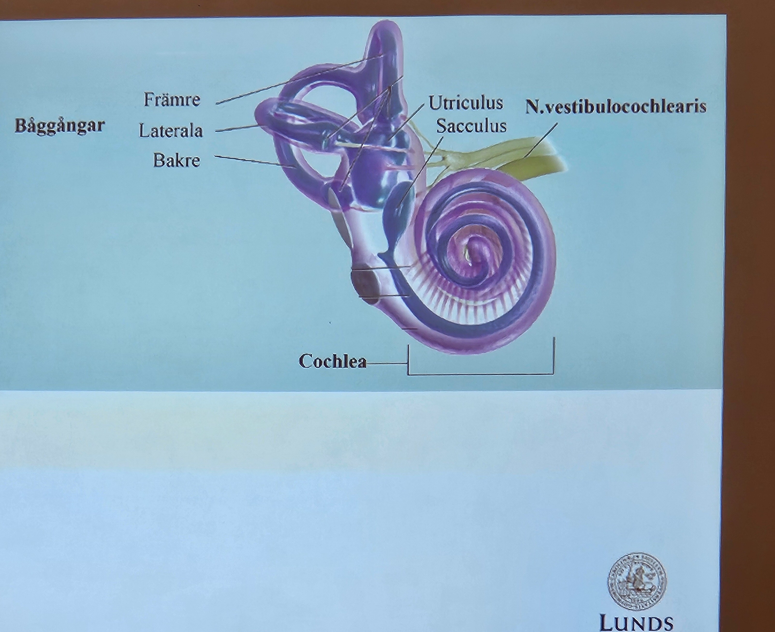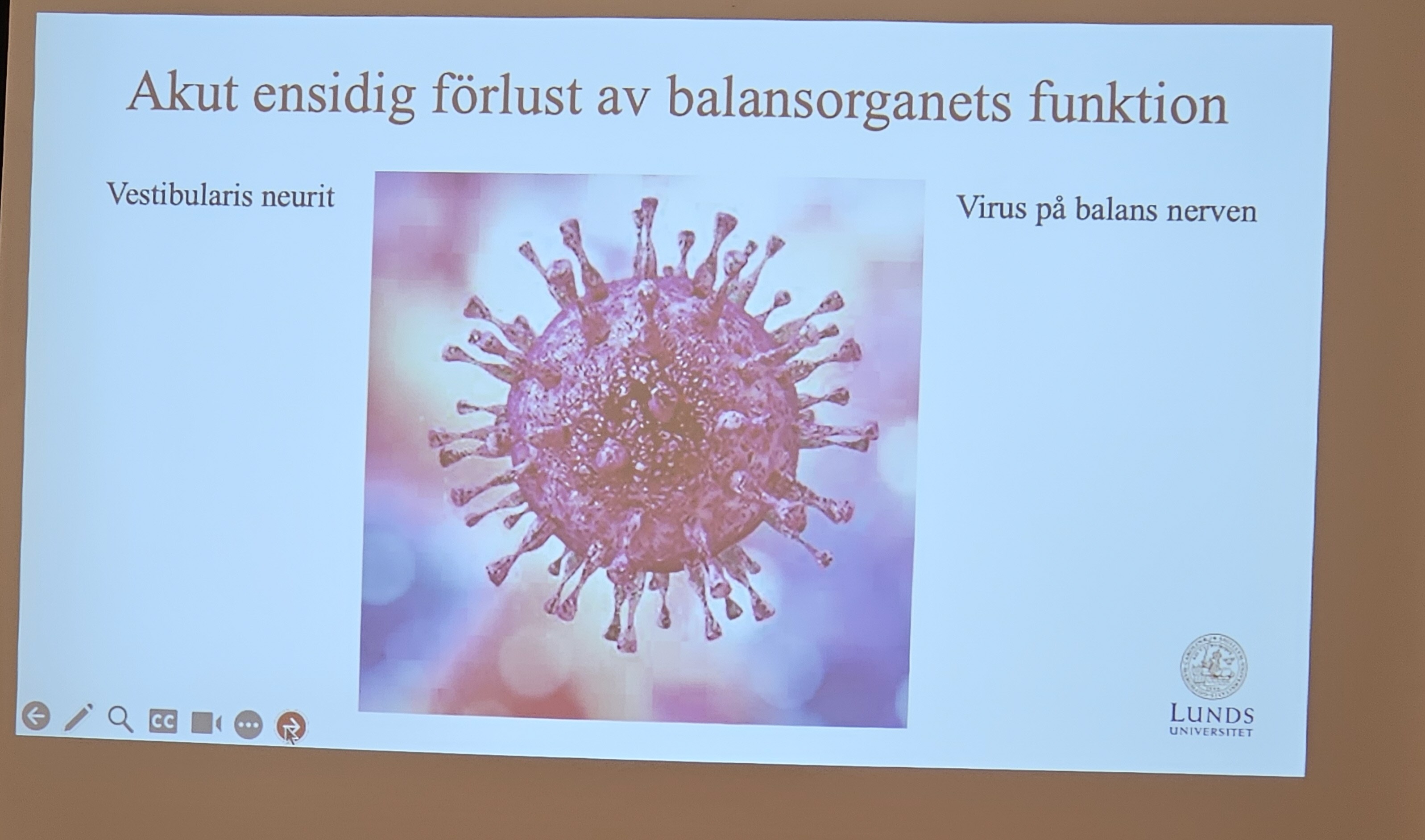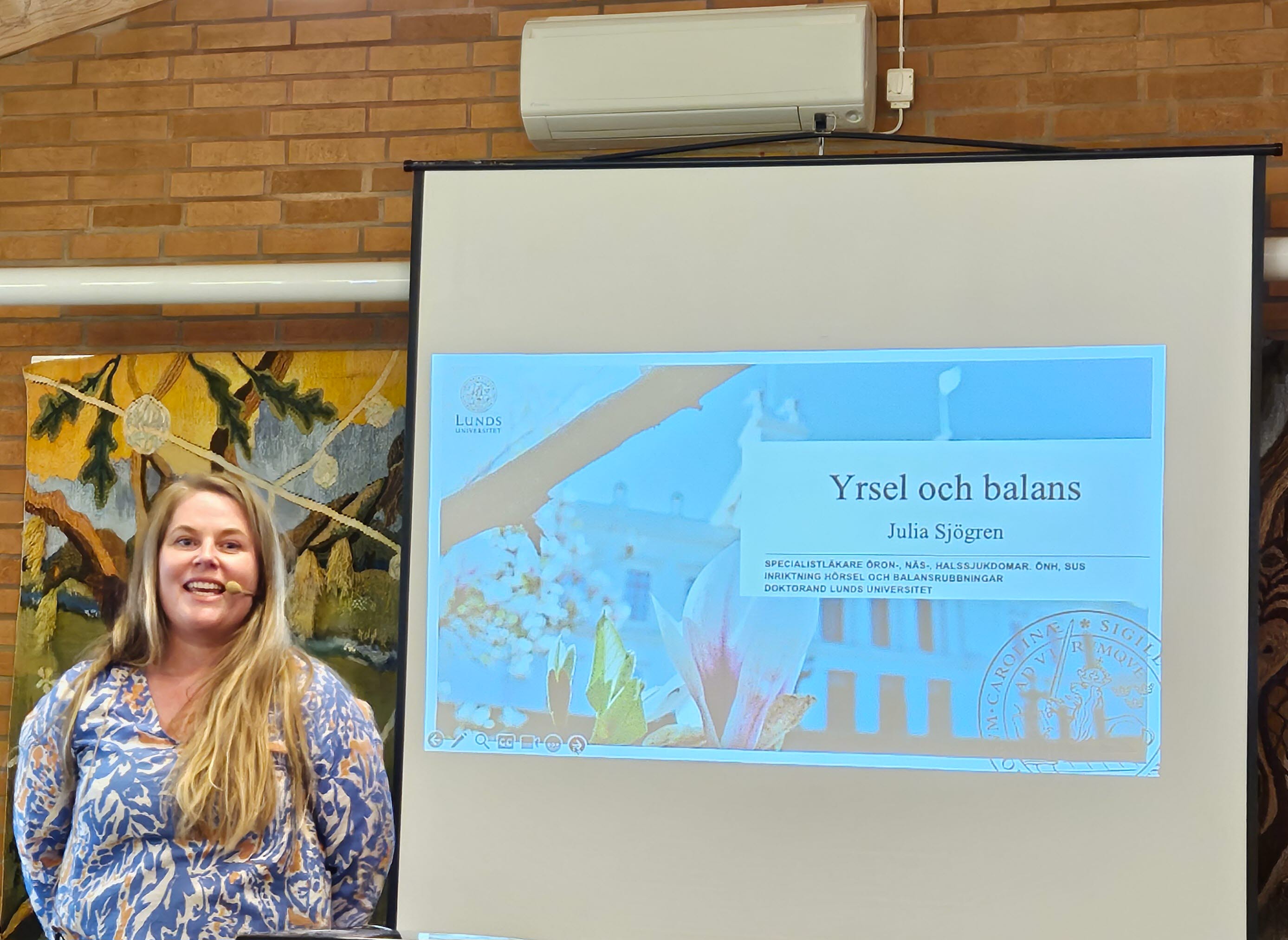 Specialistläkare för öron/näsa/hals Julia Sjögren berättade om sin forskning "Yrsel och balans". Yrsel kan ha många olika orsaker och Julia lyfte fram speciellt två orsaker, virus på balansnerven i innerörat och kristallsjuka.