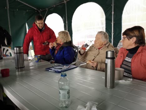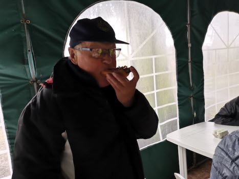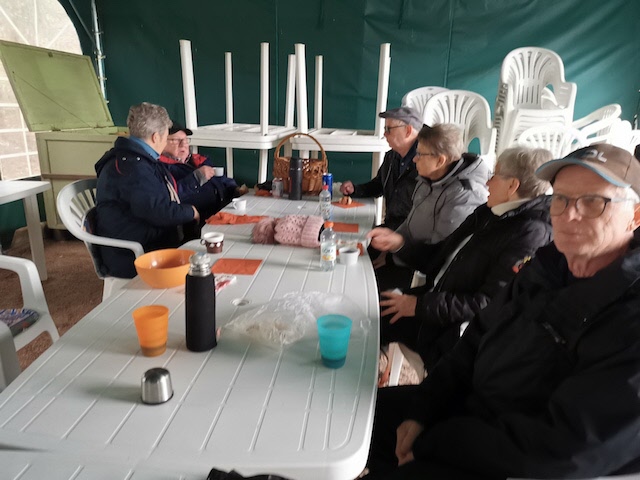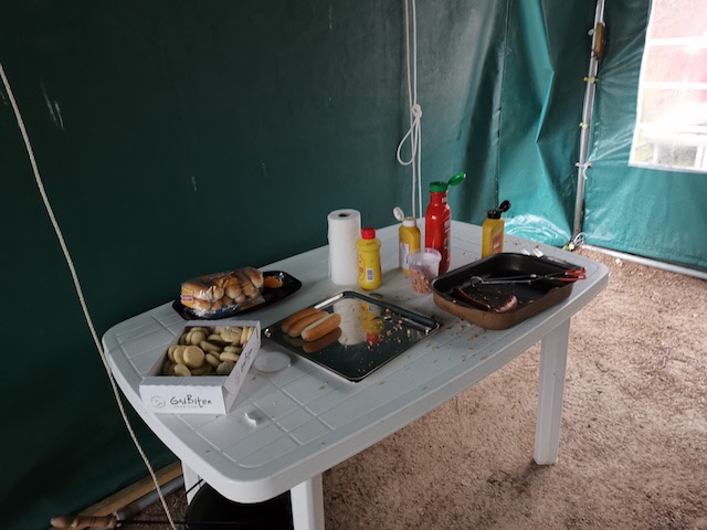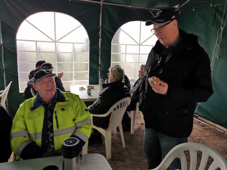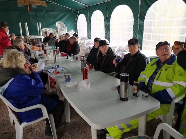 Ett 25-tal SPF-are trotsade regn och blåst för att umgås med varandra och äta korv och bröd som föreningen bjöd på, och den alltid glade och trevlige Bosse Hanson grillade till oss utanför tältet, emedan vi övriga satt inne i tältet torrt men inte så varmt. Hursomhelst var det en trevlig stund tillsammans med mycket prat och goda skratt. Ett stort tack till föreningen för god korv och ett ännu större tack till Viola och Bo Hansson, Britt-Marie och Kjell-Åke Nord för att ni ställer upp för oss andra.