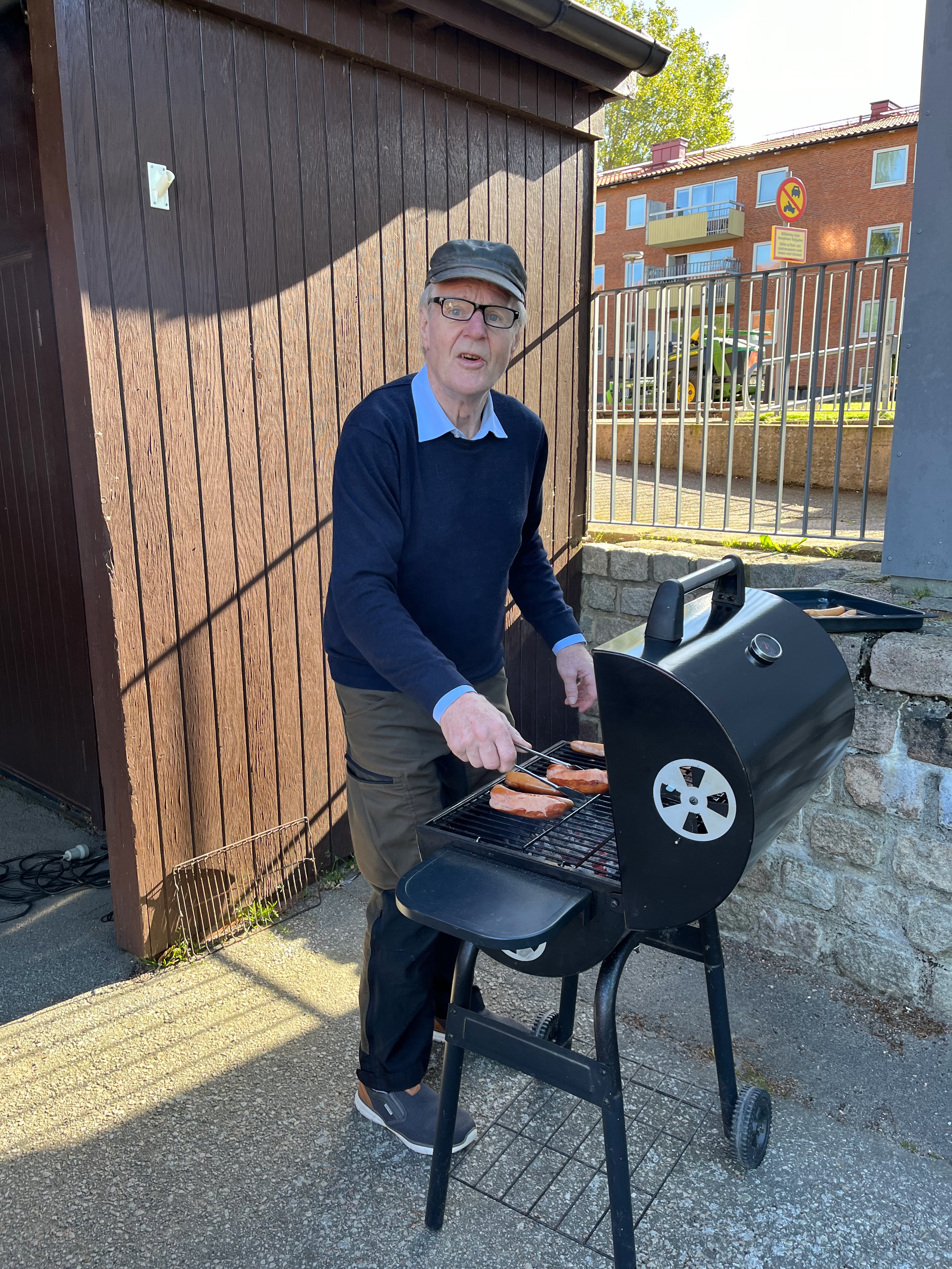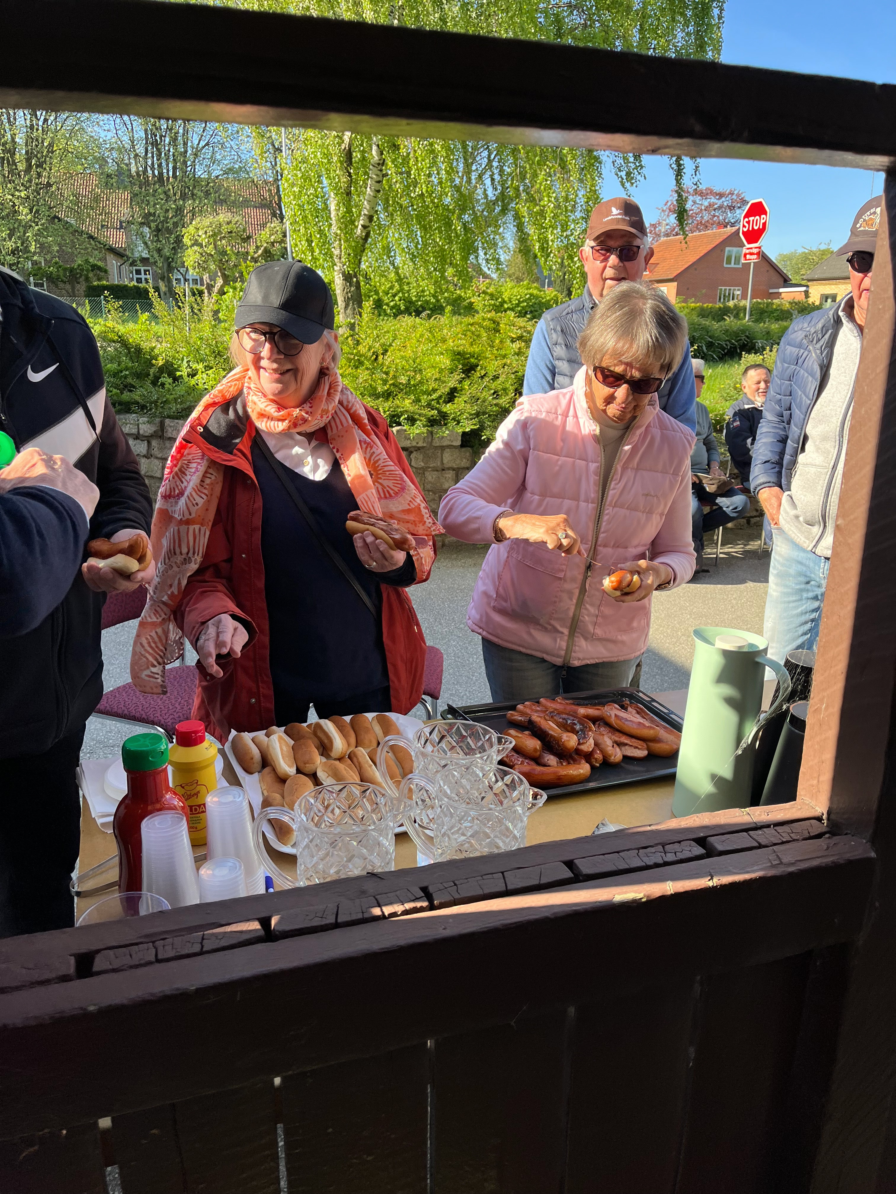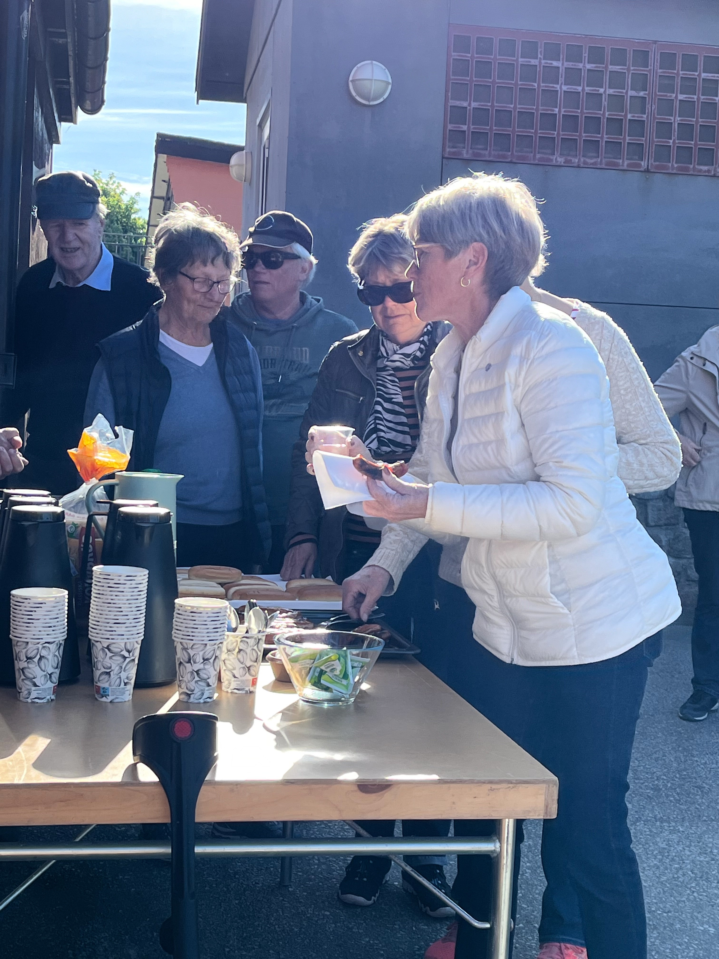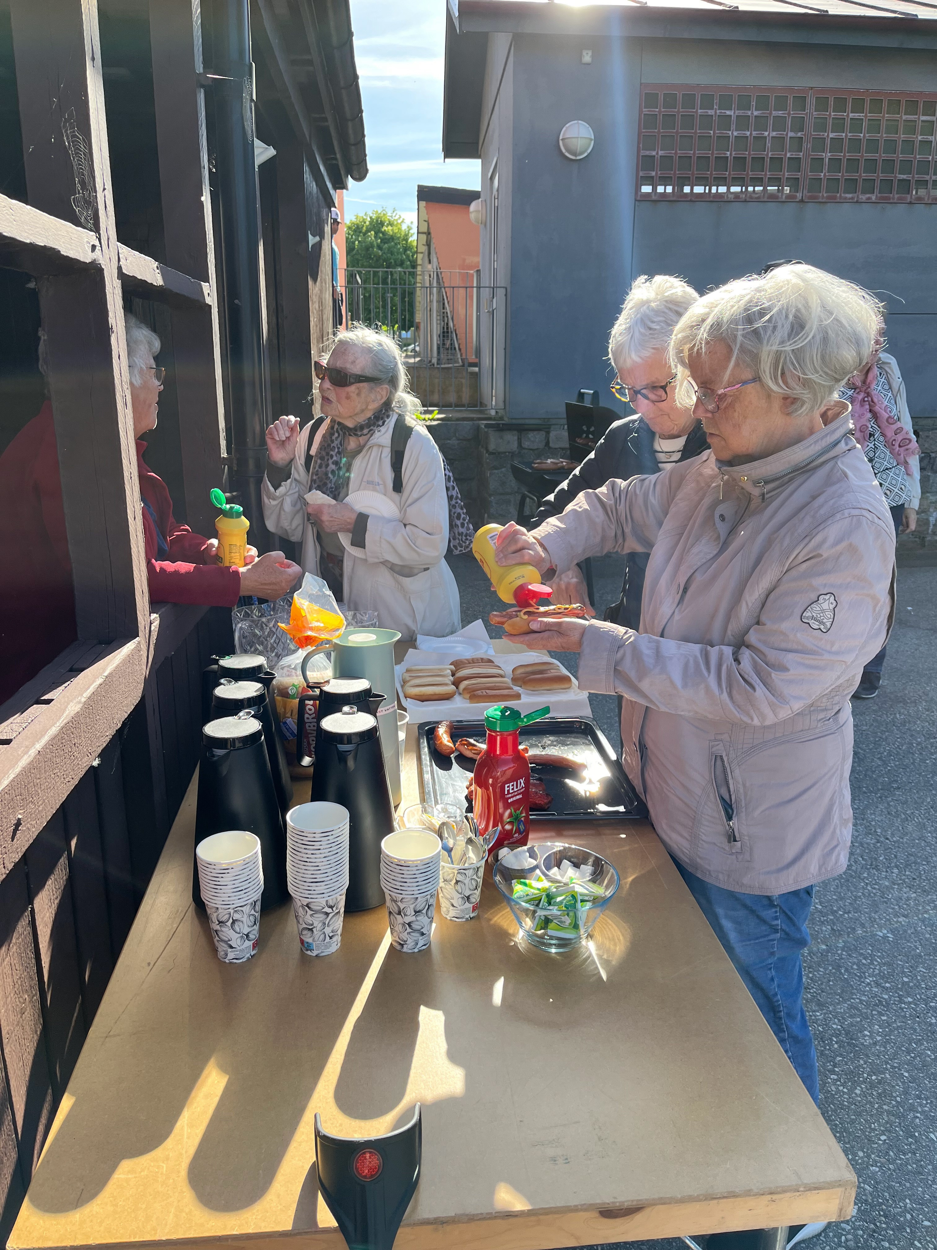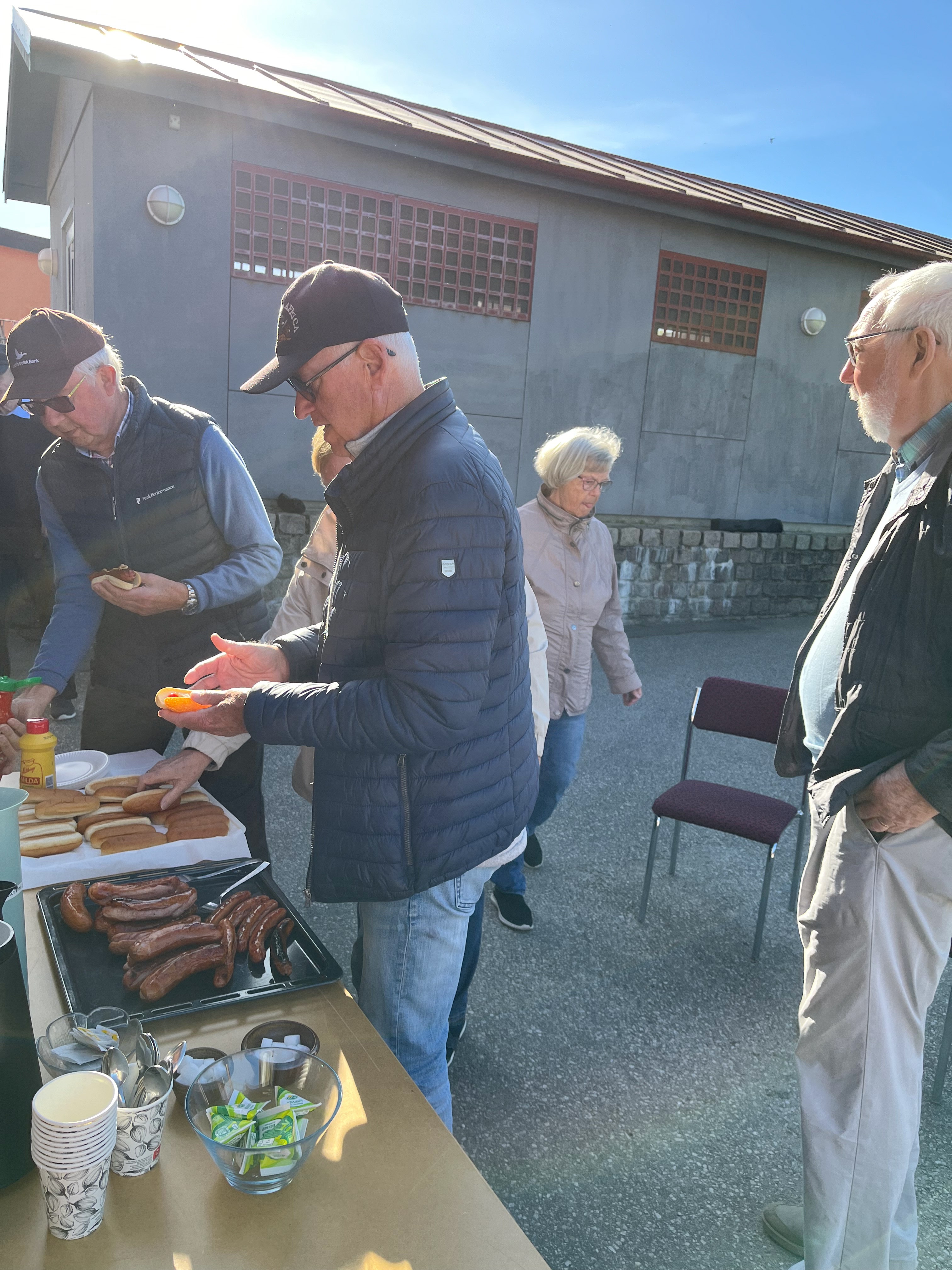 äta grillad korv och dricka kaffe med kaka.