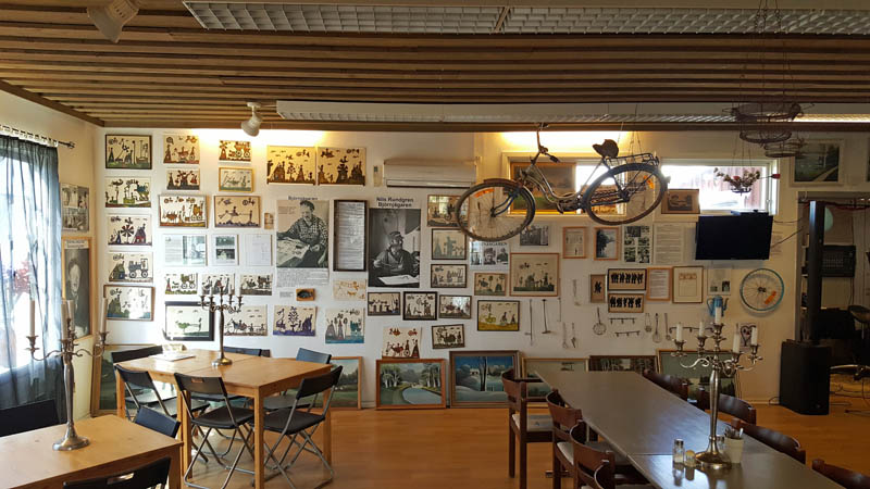 Efter glasets historia blev vi serverade en god luffarbuffé bestående av olika rätter som en luffare kunde tänkas ha ätit. Det var köttbullar, kroppkakor, skinkstek med svampsås, potatisgratäng, sill, omelett och isterband. Det smakade mycket bra. Innan maten fick vi lite underhållning av Hans på sång och gitarr. Efter lunchen kunde vi gå runt och titta allt det som Göran samlat ihop om de svenska luffarna.