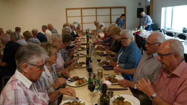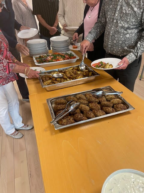 Efter en stunds god underhållning bjöds det på en härlig meny bestående av grekisk pannbiff, tzatziki och klyftpotatis. Visst låter det gott och så var det! Härliga smaker och kryddor och till detta en god dryck. Kaffe på maten som vanligt och med ett lotteri som bjöd på många glada vinnare.