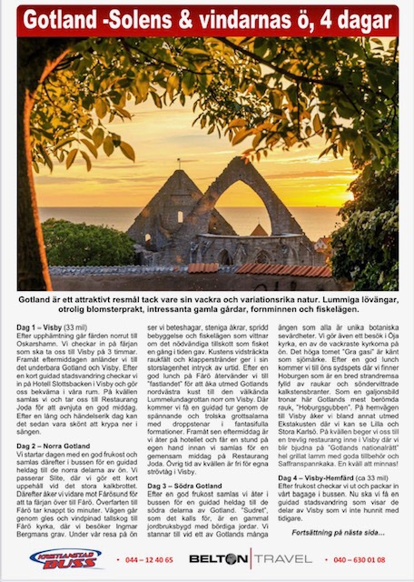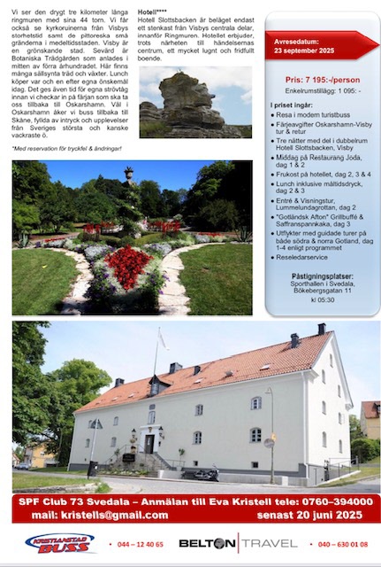 SPF Seniorerna Club 73 Svedala 250316 Hej! Ny resa är planerad till hösten. "Upplev Gotland – Solens och Vindarnas Ö", 4 dagar. Avresedatum den 23 september 2025. Kostnad 7195:-/person. Enkelrum 1095:-/person. Anmälan sker till Eva Kristell tel 0706-394000 el mail kristells@gmail.com. Senaste anmälningsdag den 20 juni 2025. Mer information kommer att lämnas på månadsmötet den 19 mars 2025, på vår hemsida och Facebook. Du kan läsa mer om resan på Svedala Senior Center, öppet 9-11.30 vardagar, där resan finns på vår anslagstavla. Med vänlig hälsning Club 73 Svedala
