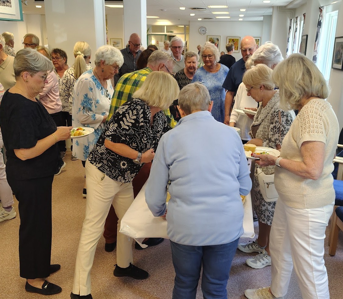 Efter ”vandringen” avnjöt vi en smörgås med dansk salami och brieost. Till detta serverades god dryck efter eget val. Som alltid var lotterierna med sina dragningar det sista inslaget i samlingen, som denna gång hade samma antal deltagare som förra månadsmötet, 94 medlemmar.