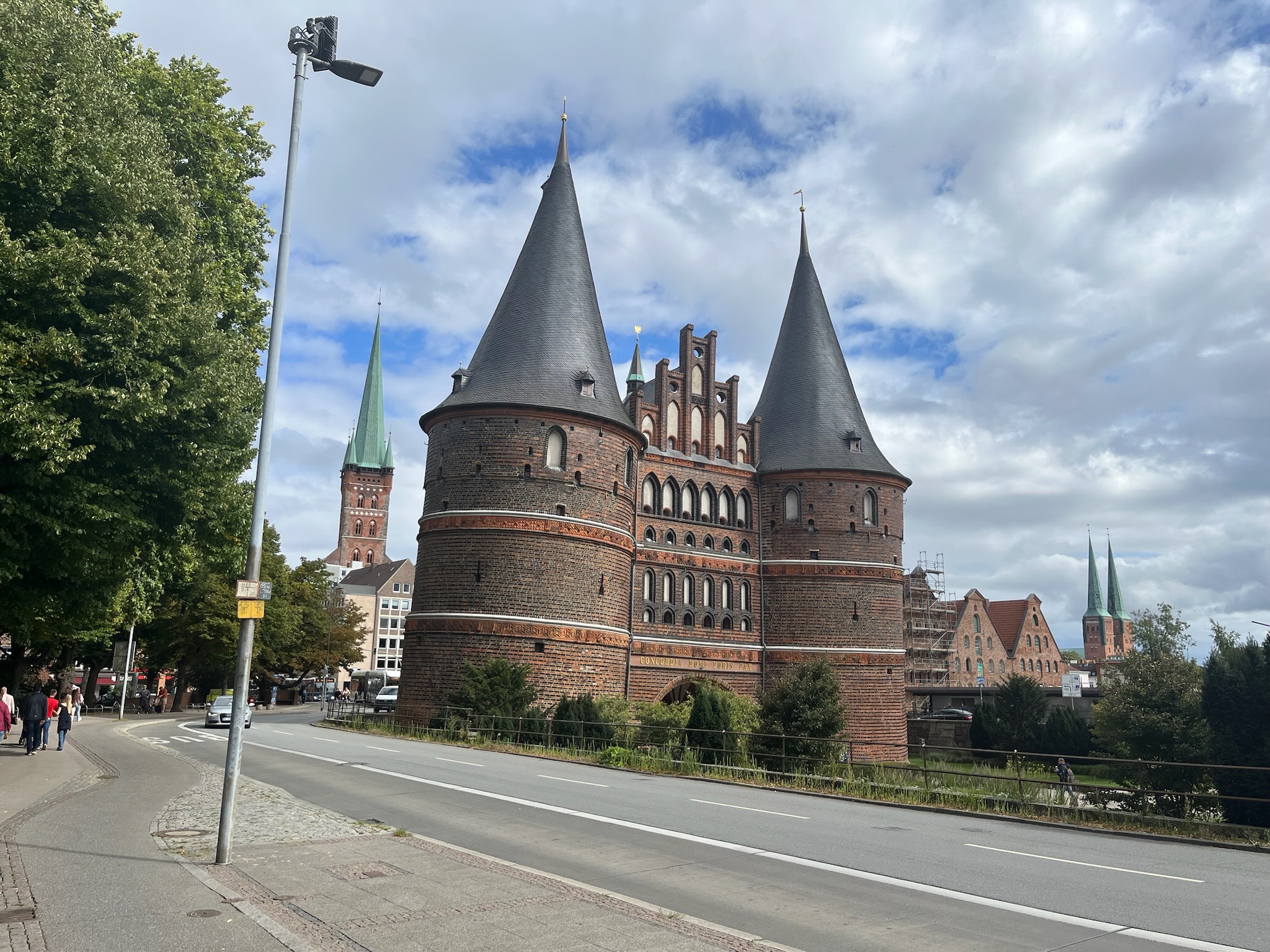 Framme i Lübeck checkade vi in på vårt hotell ca 15.00. Alla förundrades över våra vackra, fina och väl tilltagna rum. Därefter väntade en stadsrundtur till fots för de som ville. Promenaden sträckte sig från ena stadsporten (den med lutande tornen) till den andra (pampigare). Vi såg många vackra byggnader.