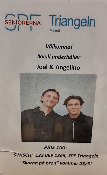 Föreningens första event 2026 den 28 januari bjöd på en medryckande sång- och musikupplevelse. Programmet ”Malmöborna bakom skorna” fick ställas in på grund av sjukdom. Det kommer i stället att äga rum den 25 mars. Det datumet skulle, enligt vad som var planerat, duon Joel och Angelino underhålla med sin sång och musik. Turligt nog kunde programmen byta plats.